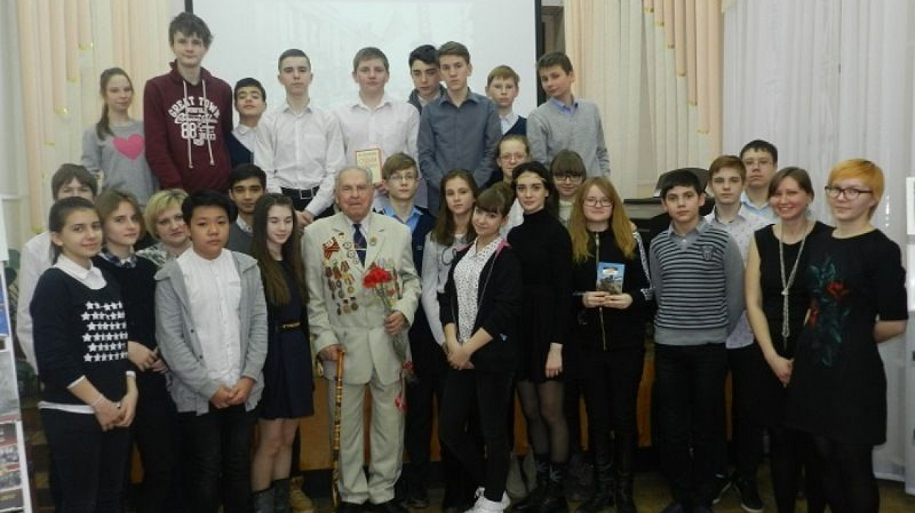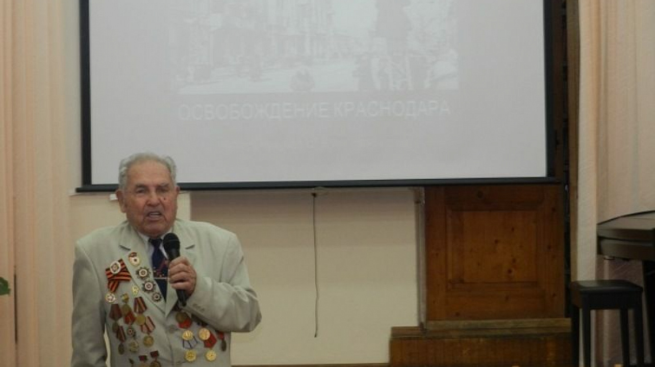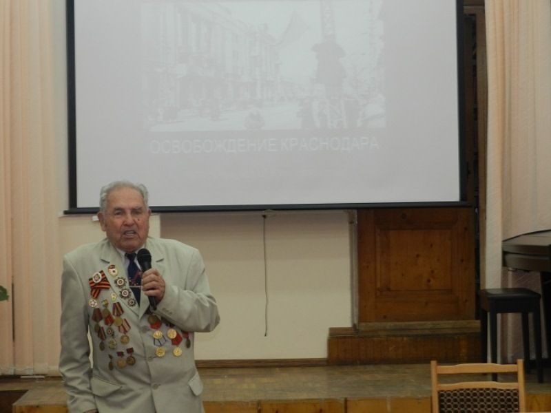 Перед юношеской аудиторией выступил почетный гость мероприятия — ветеран Великой Отечественной войны, участник боев за освобождение Краснодара — Дмитрий Шлыков, который рассказал ребятам о том, какие тяготы и лишения выпали на его судьбу во времена Великой Отечественной войны.