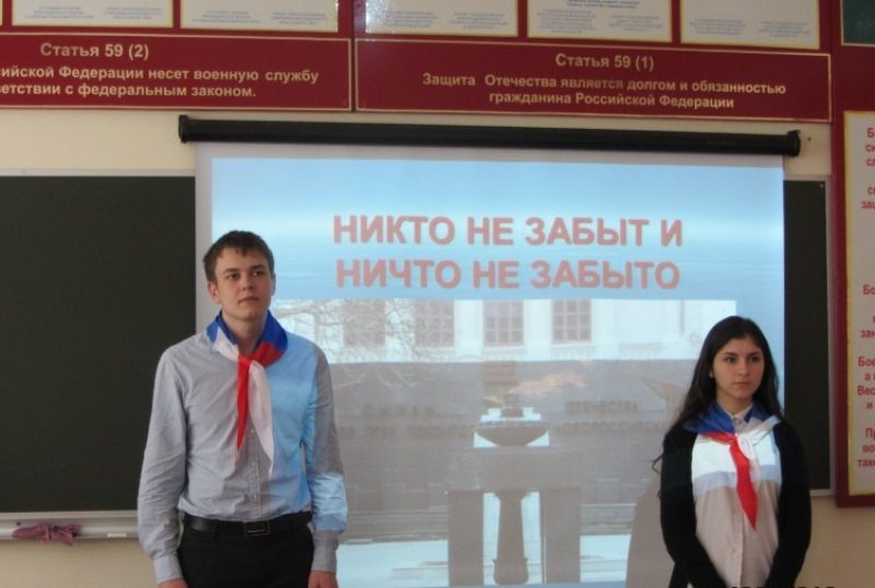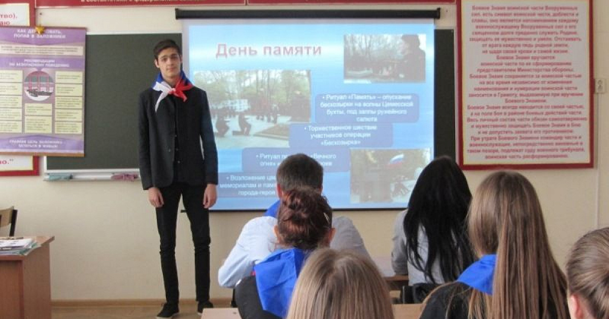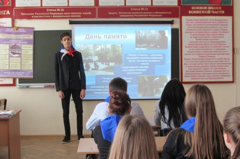 Студенты группы Нунэ Налбандян и Анастасия Суслина провели виртуальную экскурсию по мемориальному комплексу «Малая земля». Сергей Симирников рассказал о Всероссийской акции памяти «Бескозырка». Анжела Лезгиян прочитала стихотворение В.Бакалдина «Новороссийский вагон».