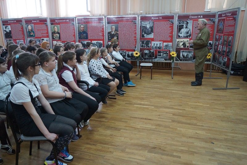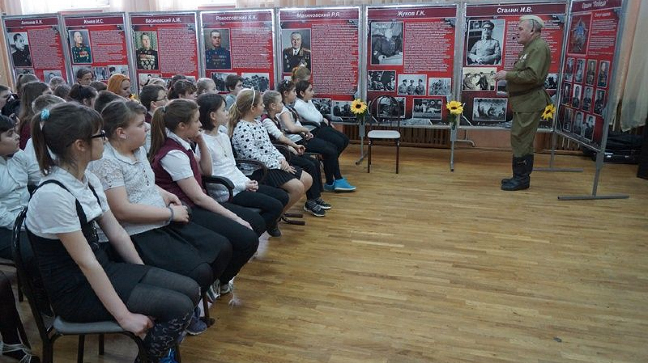 В феврале 1943 года город Краснодар был освобожден от немецко-фашистских захватчиков войсками Героя Советского Союза генерал-майора Рослого и генерал-майора Рыжова. Об этих и других полководцах Великой Отечественной войны ученики посмотрели стенды выставки и документальный фильм. Перед ребятами выступила гостья, приглашённая на мероприятие — ветеран Великой Отечественной войны Людмила Шаповалова.