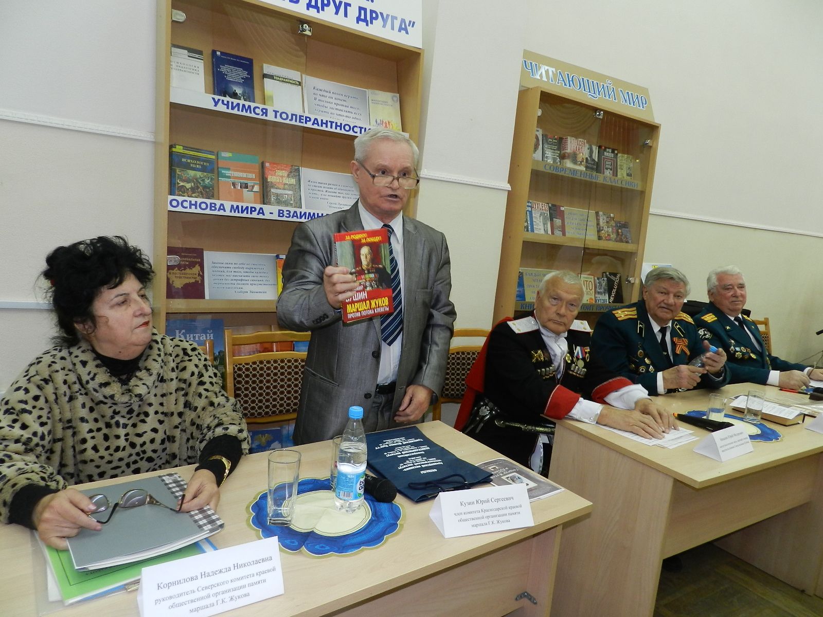 Сегодня по всей России развернулось жуковское движение. О его нужности и значимости в деле патриотического воспитания молодежи рассказали Н. Н. Корнилова, руководитель Северского комитета краевой общественной организации памяти маршала Г. К. Жукова, в докладе «Помним, чтим и славим великого патриота» и Т. Е. Носкова, заведующая библиотекой им. К. А. Обойщикова (филиал № 31 МУК ЦБС города Краснодара), выступив с докладом «Растим патриотов России» о работе клуба «Юный жуковец».