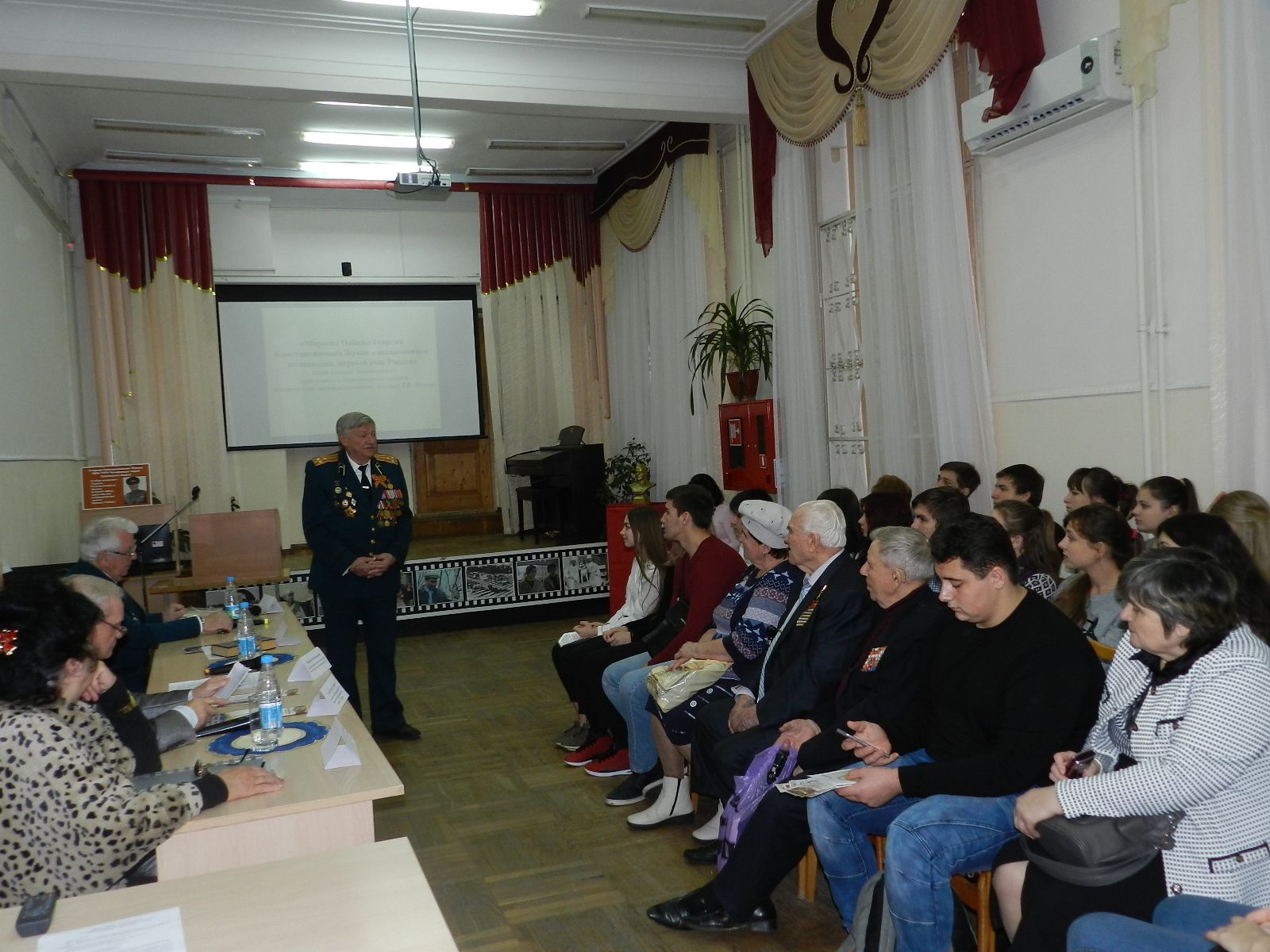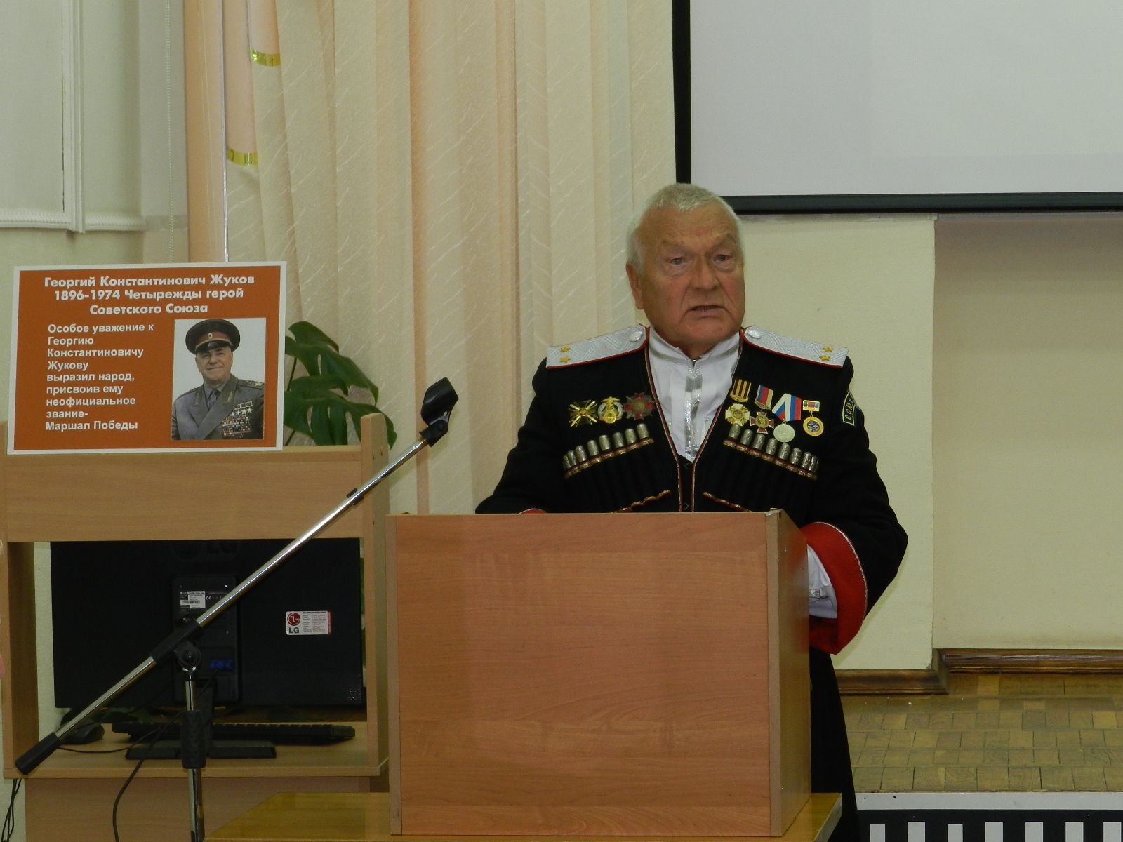 С докладом «Маршал Победы Георгий Константинович Жуков — выдающийся полководец, верный сын России» выступил Г. П. Гагай, член комитета Краснодарской краевой общественной организации памяти маршала Г. К. Жукова. Георгий Поликарпович подробно рассказал собравшимся о жизни и боевом пути маршала.
