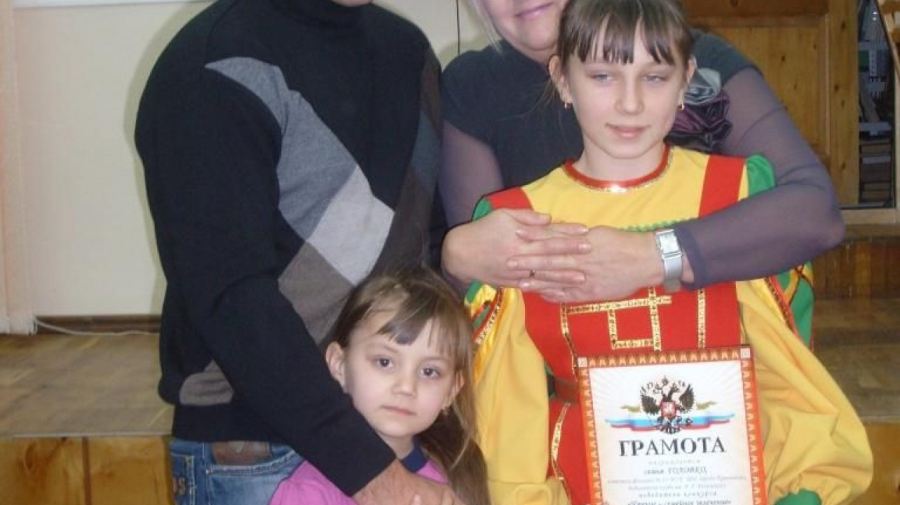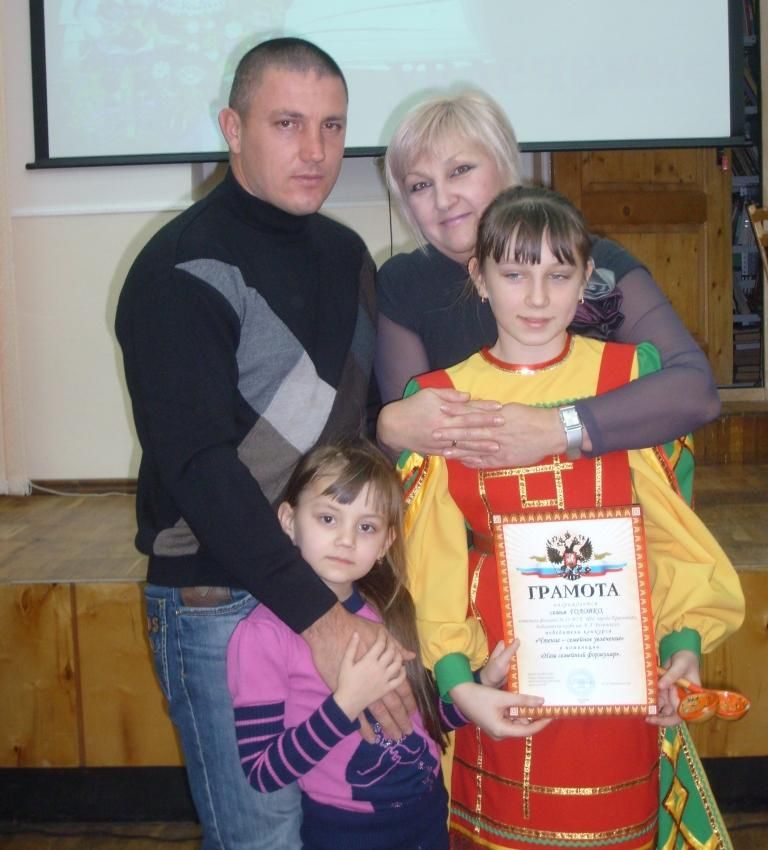 В номинации "Наш семейный формуляр" были награждены читатели библиотеки-клуба им. В. Г. Белинского семьи Головко и Грушенко. Александр Владимирович и Виктория Михайловна Головко воспитывают двух дочерей – Кристину и Ангелину. Папа принимал участие в боевых действиях, а сейчас он на пенсии и очень любит читать. Мама увлекается литературой по прикладному искусству и занимается рукоделием. Родители привили дочерям любовь к чтению и библиотеке. Старшая Кристина представляла библиотеку-клуб им. В. Г. Белинского на краевом конкурсе "Кулинарная симфония", посещает кружок прикладного искусства в детской школе искусств "Овация", кружок сольного пения, участница ансамбля ложкарей "Барыня".