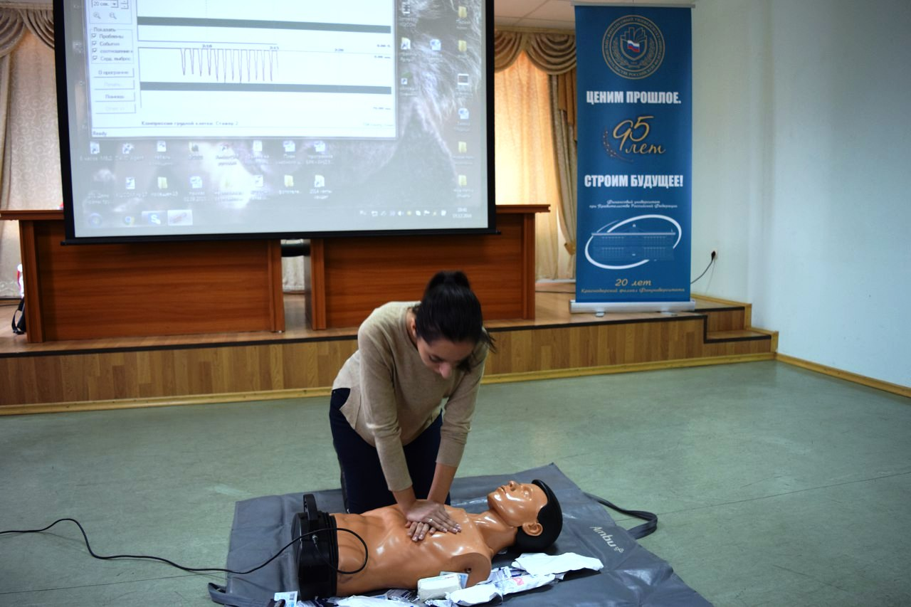20 декабря 2016С 13 по 15 декабря в Краснодарском филиале Финансового университета при Правительстве Российской Федерации работники Государственного бюджетного учреждения здравоохранения «Региональный центр медицины и катастроф», совместно с руководством филиала в рамках соглашения о сотрудничестве организовали и провели для студентов обучающий семинар по приёмам оказания первой медицинской помощи пострадавшим.