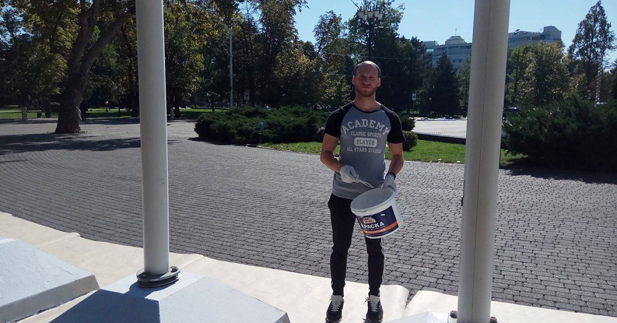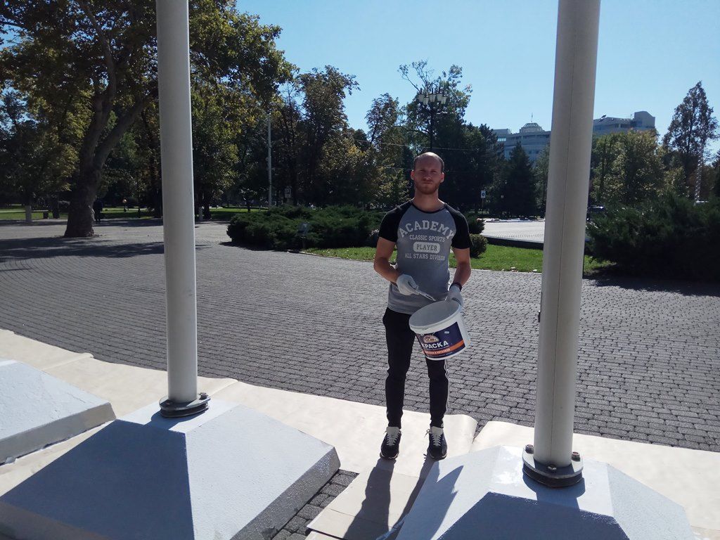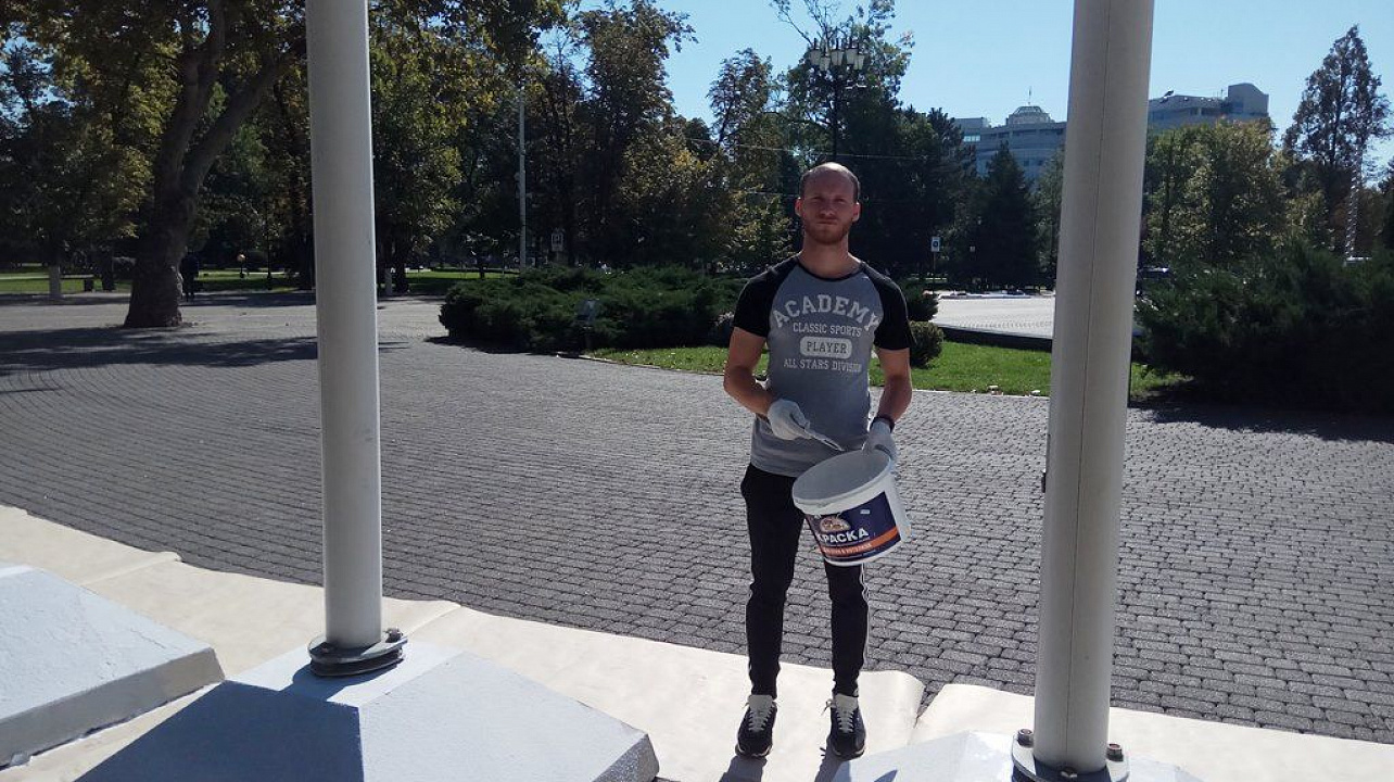В это же время на улице Красной перед зданием ЗСК также проходили покрасочные работы. Сотрудники администрации округа и работники Краснодарского
