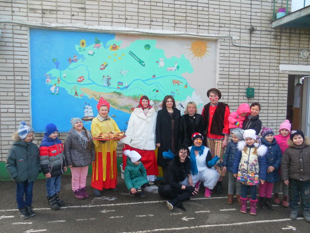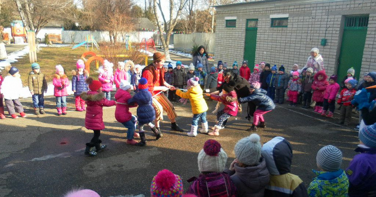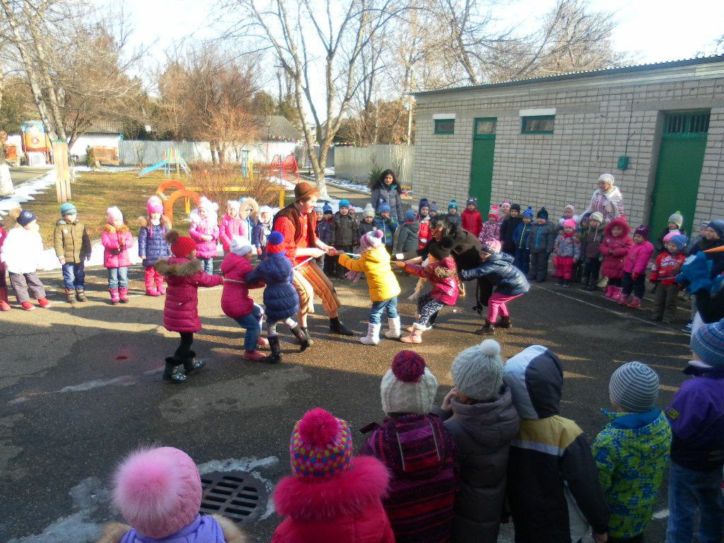 Развлечение, как и положено масленице, прошло во дворе детского сада.