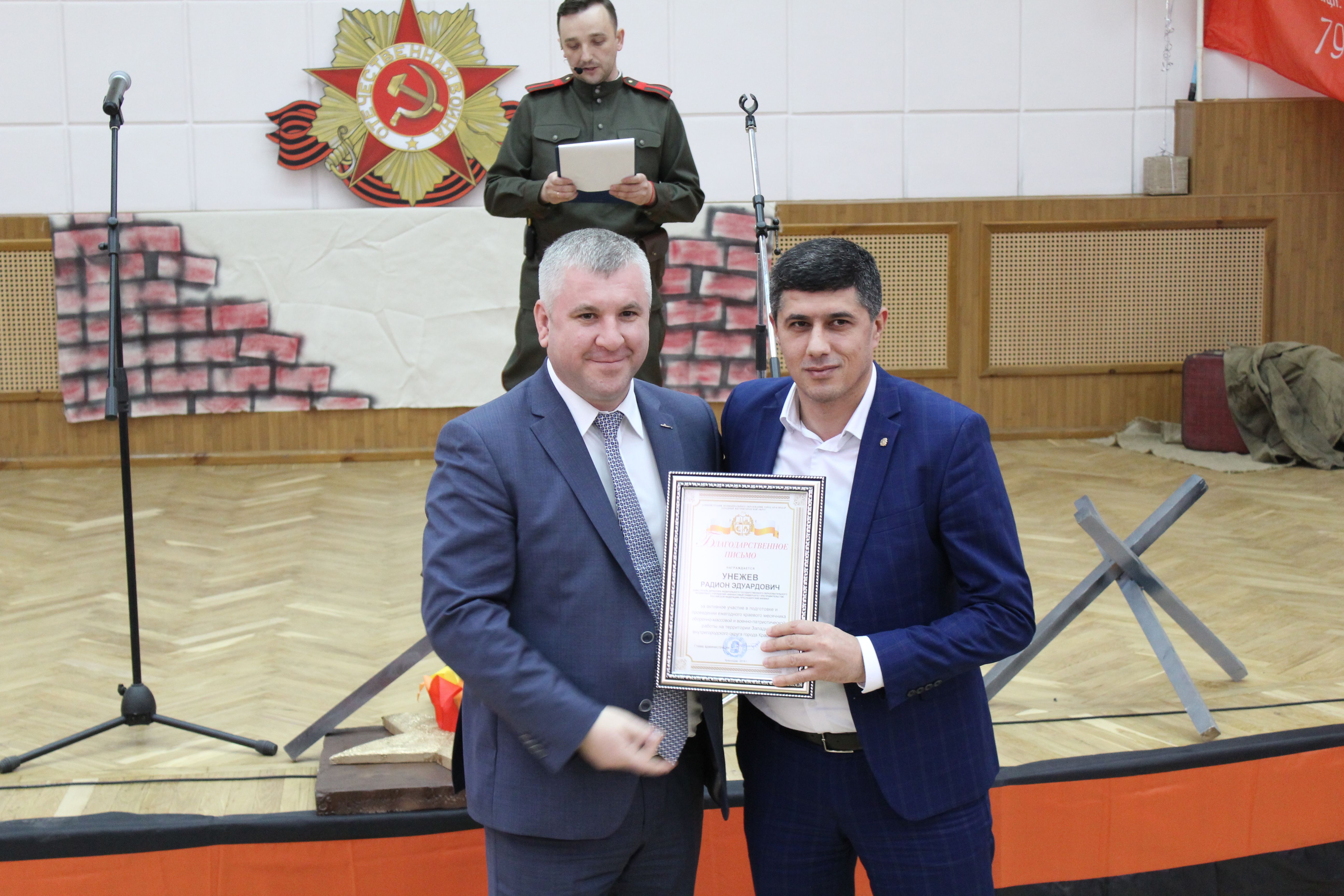 Благодарственными письмами главы администрации Западного внутригородского округа города Краснодара за активное участие в месячникеоборонно-массовой и военно-патриотической работы были отмечены самые лучшие творческие коллективы, сотрудники общеобразовательных учреждений, сотрудники военного комиссариата и многие другие.