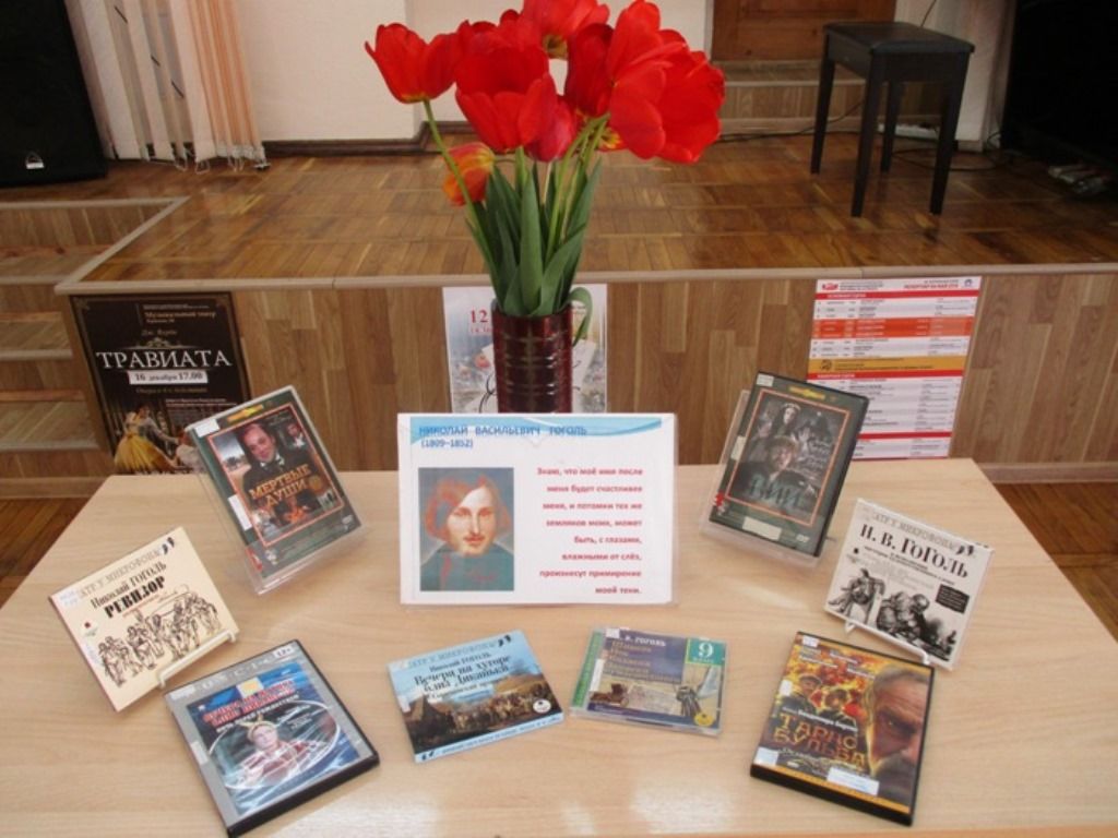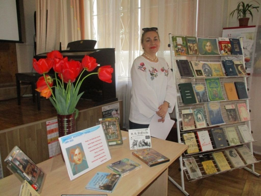 Ведущая подготовила книжную выставку «Отчизна есть то, что ищет душа…», на которой были представлены книги и аудиовизуальные материалы по теме. Встреча началась с видеопрезентации «Николай Васильевич Гоголь – к 210-летию со дня рождения».