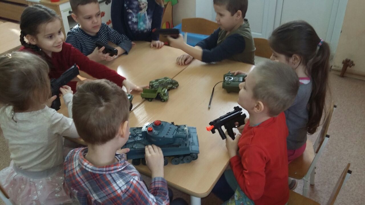 Мальчики хотели защищать нашу Родину, а девочки охотно помогали мальчикам, в качестве медсестёр.