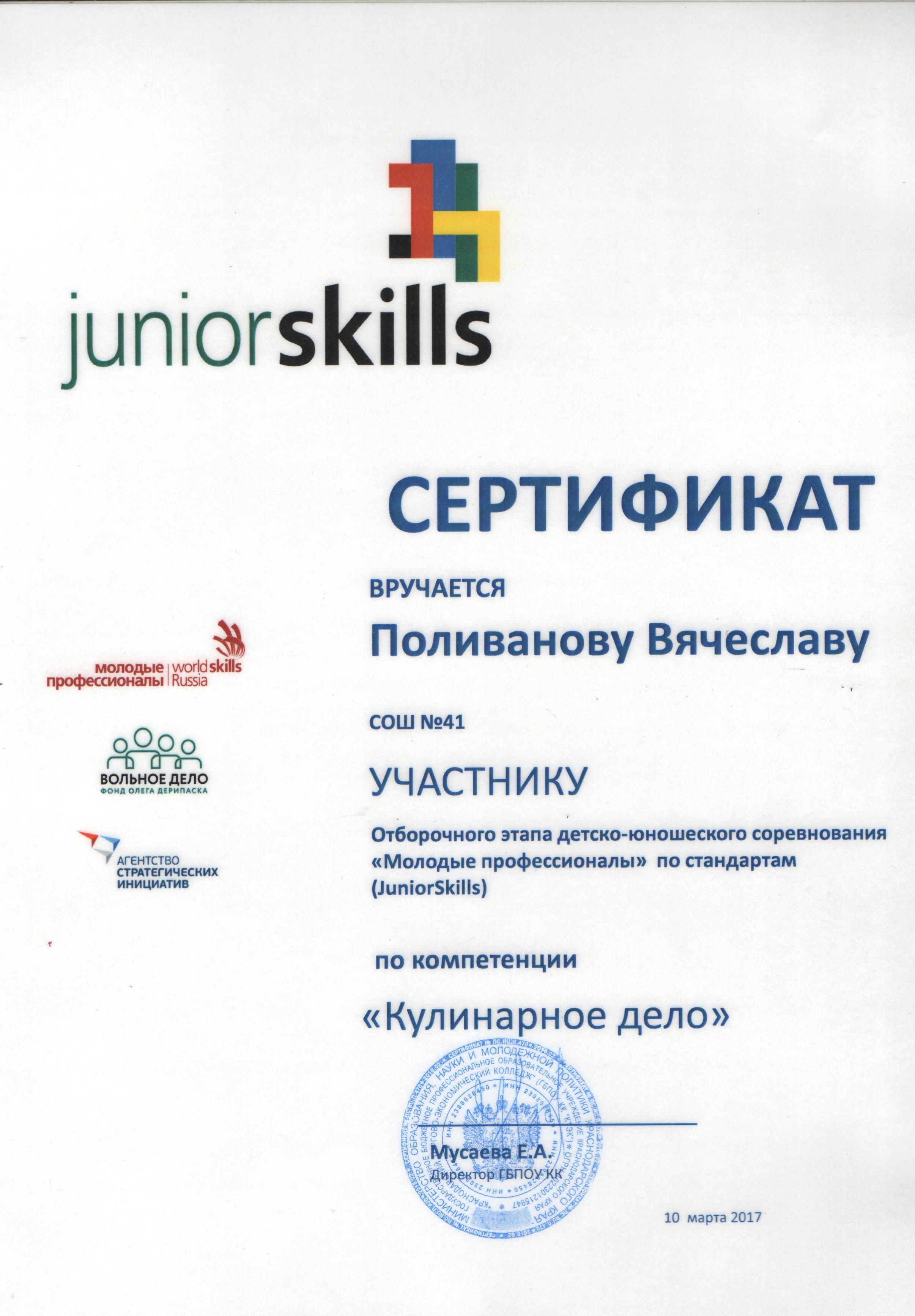 24 марта 201723 марта 2017 года в специализированном центре компетенции JuniorSkills «Кулинарное дело» на базе «Краснодарского торгово-экономического колледжа» прошел отборочный этап детско-юношеских соревнований «Молодые профессионалы» по стандартам JuniorSkills для определения участников Национального этападетско-юношеского соревнования «Молодые профессионалы».