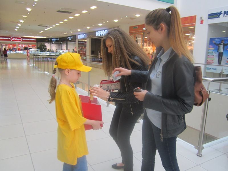 Все покупатели торгового центра получили возможность внести посильную помощь нуждающимся детям. Волонтеры – Лизонька и Кот Леопольд на протяжении всей концертной программы занимались сбором денег в фонд для одаренных ребят из малообеспеченных семей.