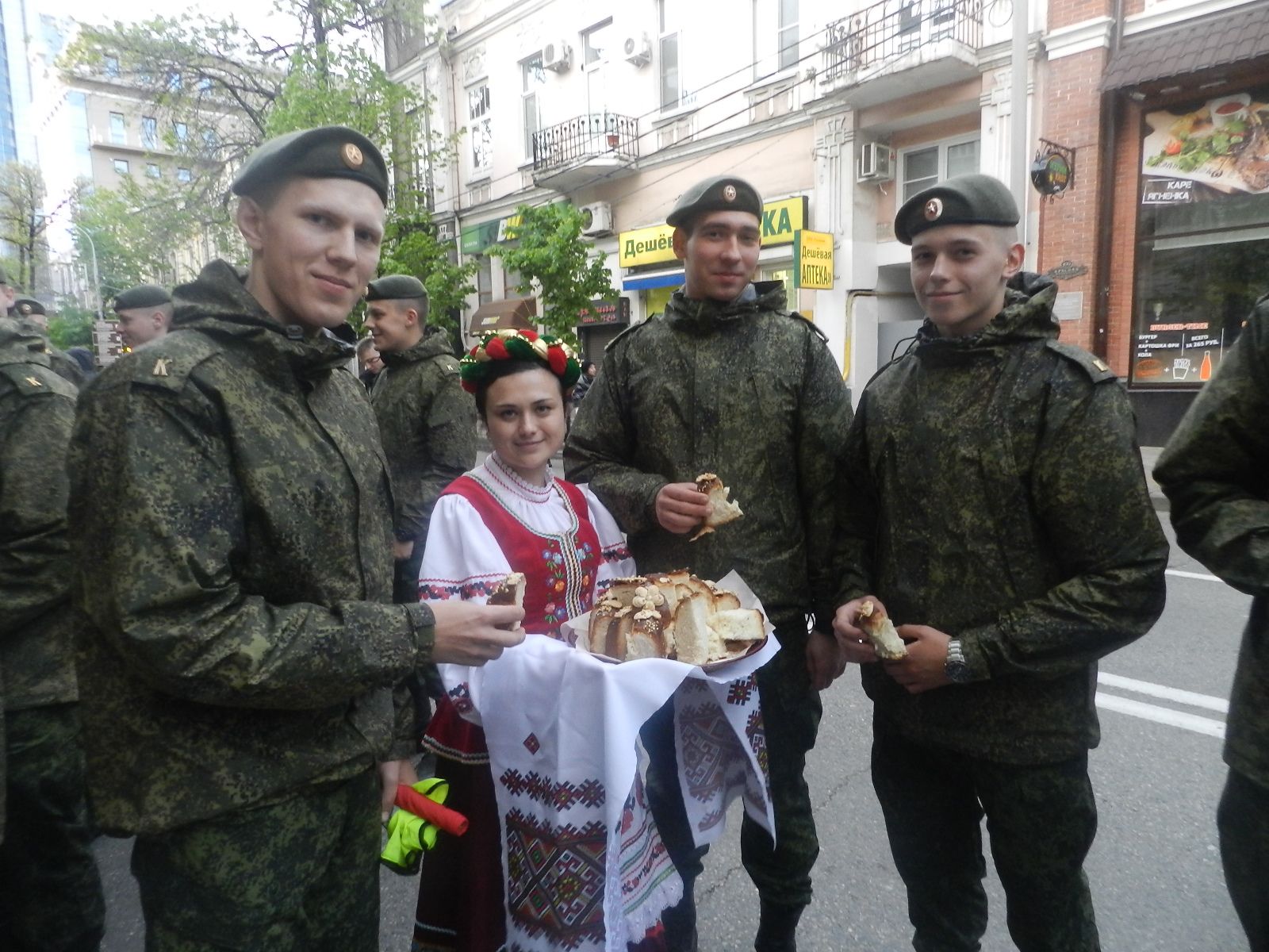 Встречали гостей казак и казачка ароматным караваем, символизирующим богатство и плодородие Кубани.