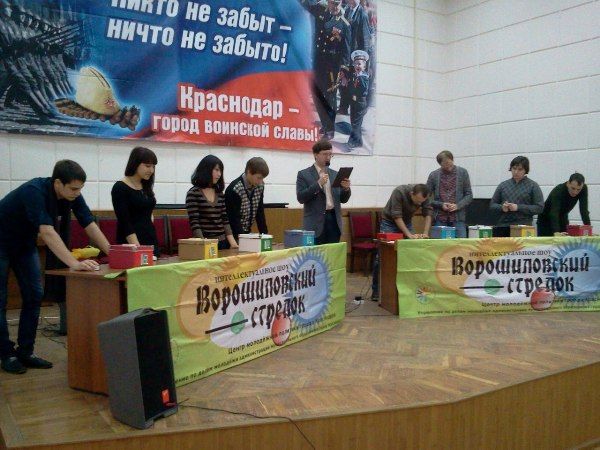 27 марта 201324 марта в актовом зале администрации Западного внутригородского округа прошёл 4-й этап III Открытого чемпионата г. Краснодара по игре «Интеллектуальное шоу «Ворошиловский стрелок».