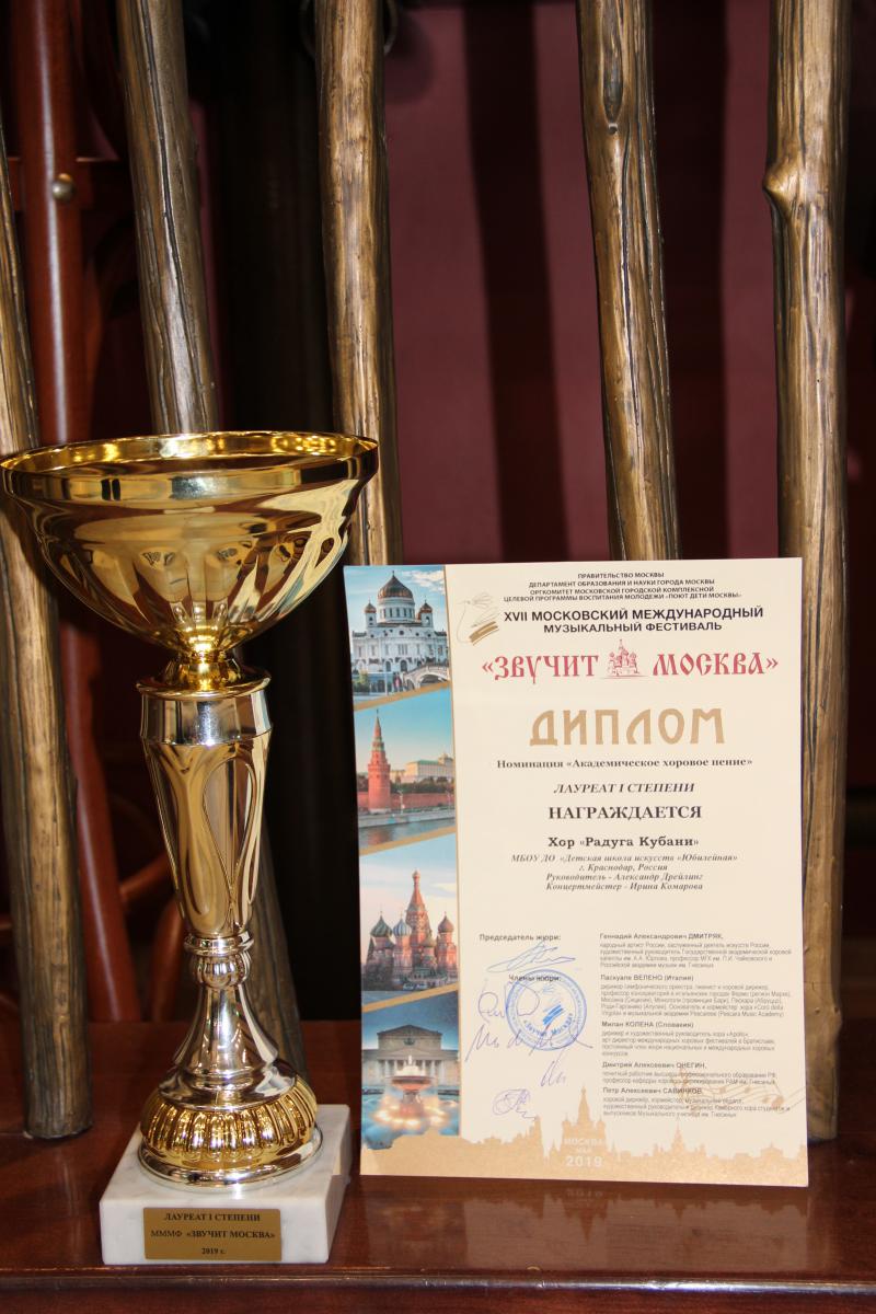 Хор «Радуга Кубани» ДШИ «Юбилейная» под руководством заслуженного работника культуры РСФСР, заслуженного деятеля Всероссийского музыкального общества Александра Дрейлинга и концертмейстера Комаровой Ирины достойно представил свою конкурсную программу и получил диплом Лауреата I степени в номинации «Академическое хоровое пение». Также краснодарским юным артистам вручили Кубок победителей.