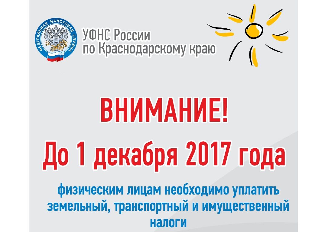 29 ноября 2017Налоговая служба приступила к формированию единых налоговых уведомлений на уплату земельного, имущественного и транспортного налогов за 2016 год. Свою гражданскую обязанность налогоплательщикам предстоит исполнить в срок до 1 декабря 2017 года.