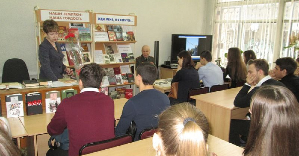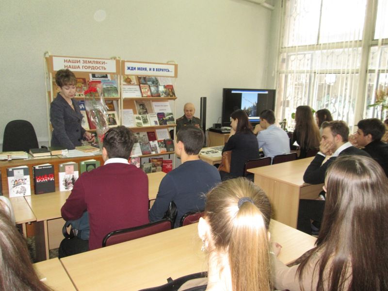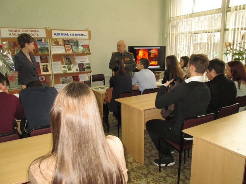 Участниками встречи стали учащиеся 11 класса гимназии № 18. На выставке была представлена литература, отражающая тему войны, воспитания патриотизма: исторические и художественные произведения, периодическая литература, цитаты, отрывки известных стихов. Учащиеся вспомнили, как началась Великая Отечественная война, услышали отрывки из писем фронтовиков, не вернувшихся с войны, посмотрели фрагменты документальной хроники, рассказывающей о начале войны, о капитуляции фашистской Германии, фрагменты фильма «Сын бойца» из «Боевого киносборника» 1942 г выпуска. Прозвучали стихи и песни военных лет.