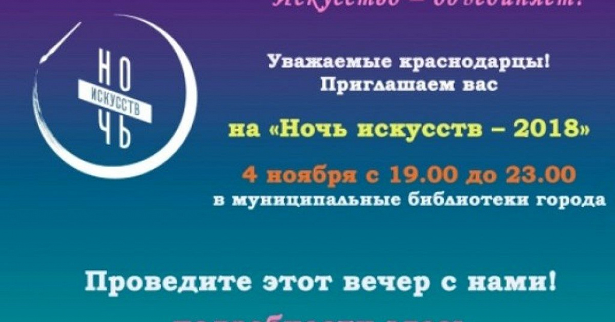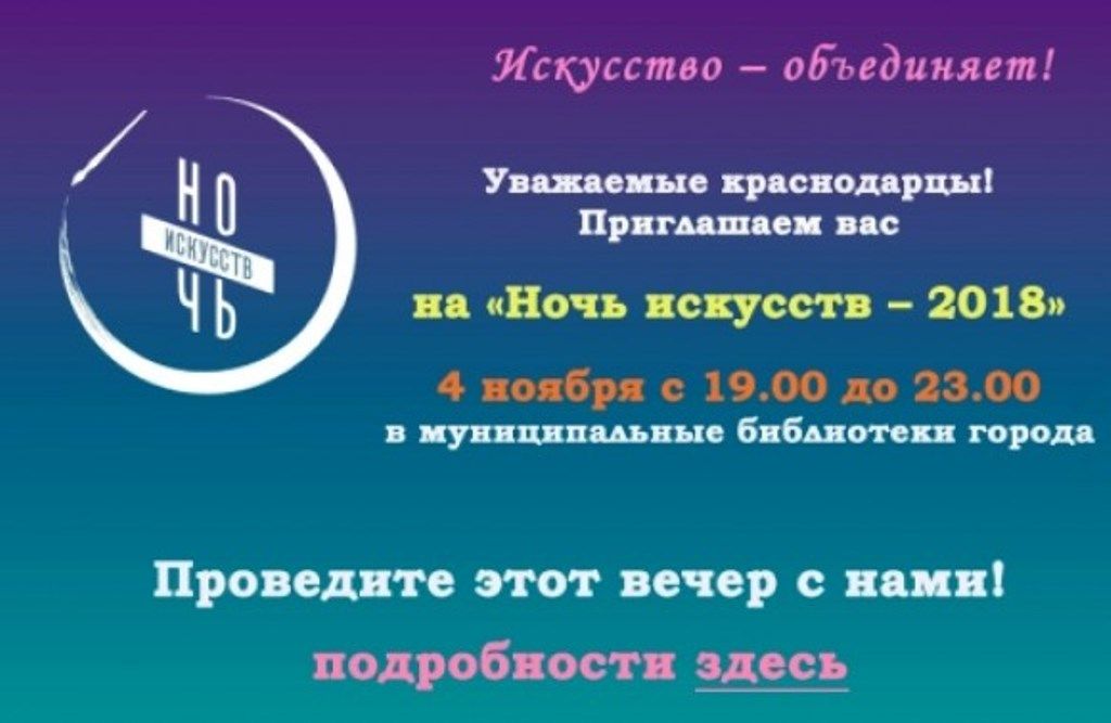 Общегородская культурная акция пройдет в Краснодаре 4 ноября с 19.00 до 23.00. В этом году библиотека им. Н. А. Некрасова подготовила арт-проект «Осеннее вдохновение». Краснодарцев ждут интересные мастер-классы: «Фантазии волшебных ладошек», «Крендель», «Осенняя палитра», литературный поединок «Между прошлым и будущим», выставка картин «Волшебный мир живописи», музыкальный вечер «Звенит высокая струна».