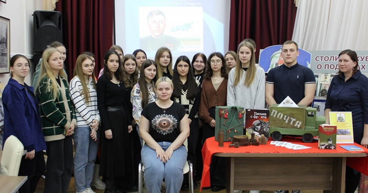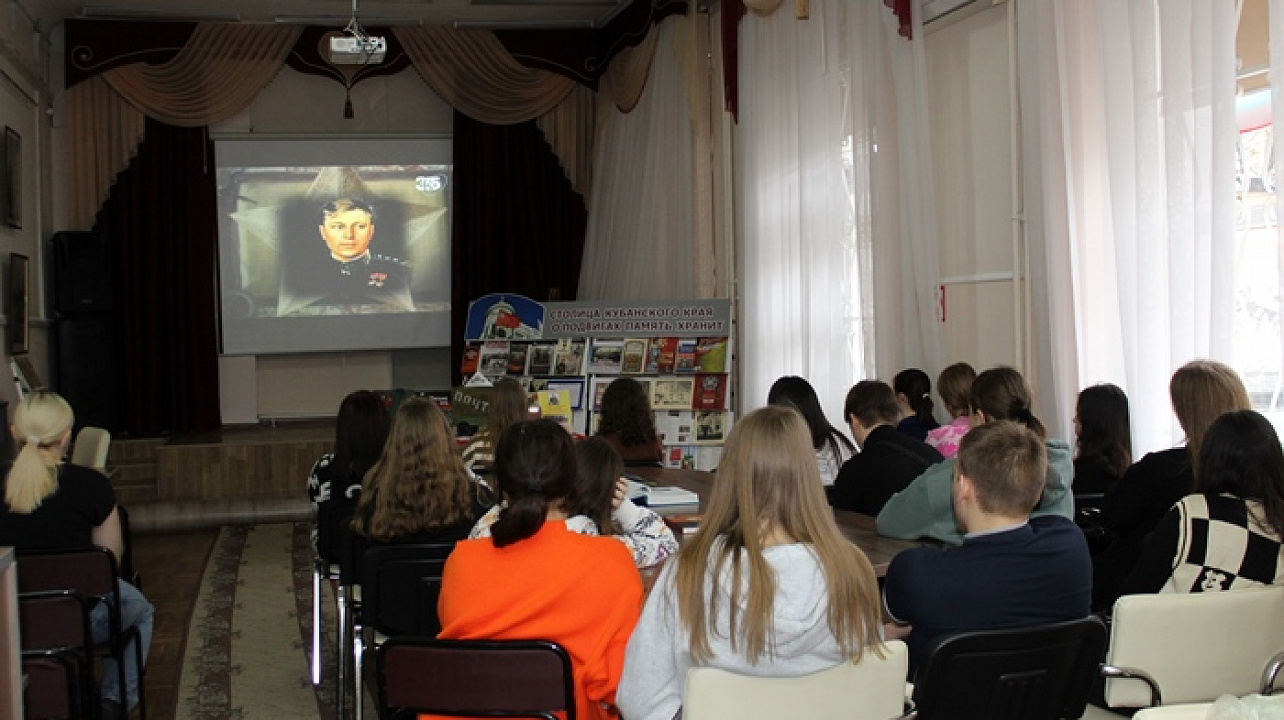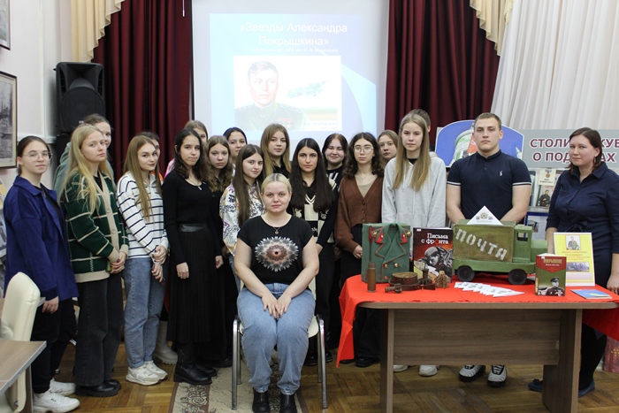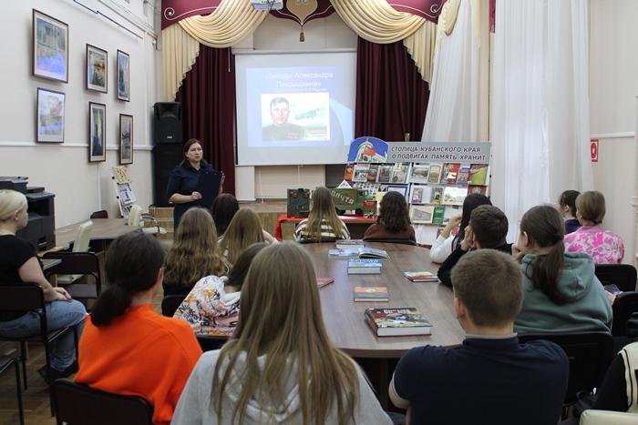 Студенты познакомились с книгами прославленного аса «Твоя почетная обязанность» и «Небо войны», проследили его боевой путь. Ведущая рассказала, что в воздушных боях на Кубани А. Покрышкин проявил себя опытным летчиком и разработчиком тактики «скоростные качели» и «кубанская этажерка».