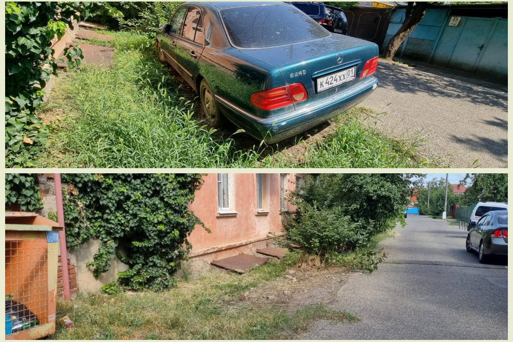 Mersedes-Benz , государственный регистрационный знак К 424 ХХ 01, с внешними свидетельствами длительного отсутствия его эксплуатации; - вблизи многоквартирного дома № 61 по ул. Фрунзе, находилось транспортное средство Mitsubishi, государственный регистрационный знак А 941 у.е. 01, в аварийном состоянии.