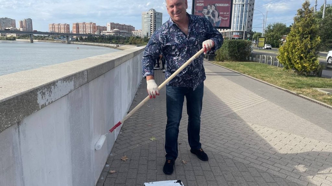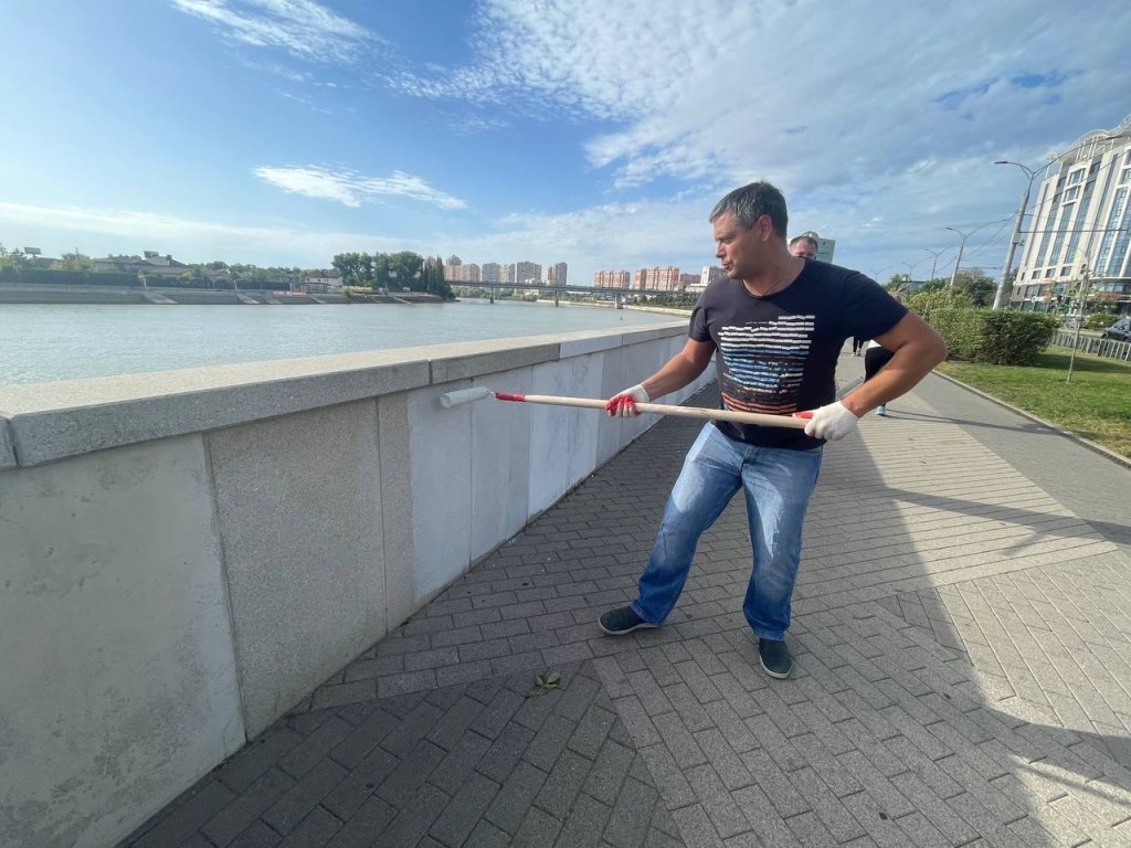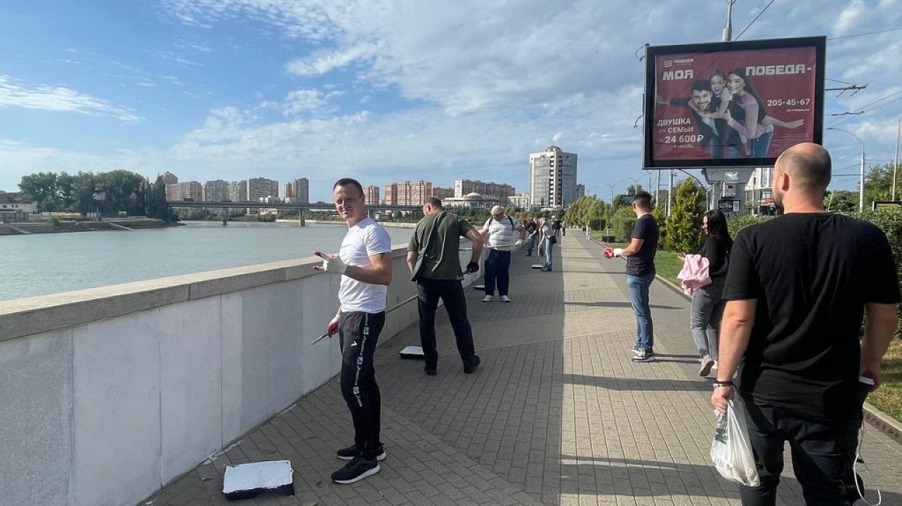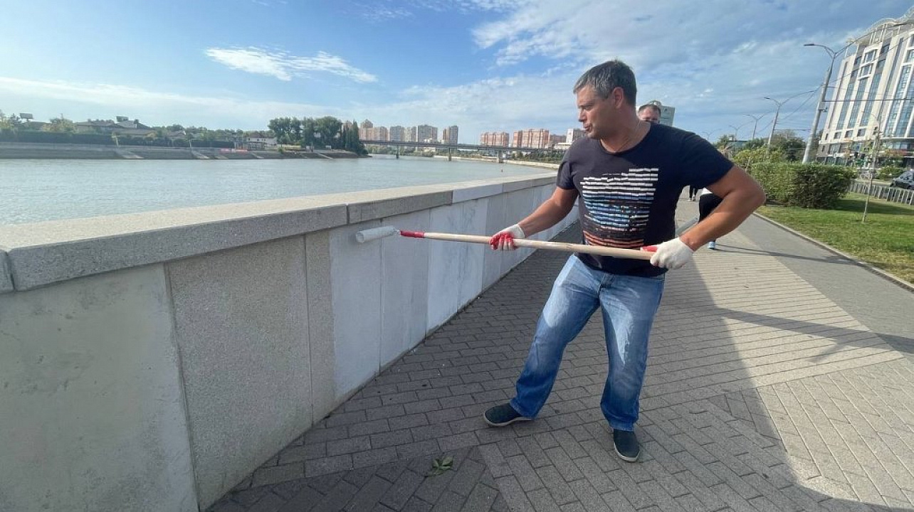 Трудовой коллектив дружно закрасили граффити на бетонном парапете вдоль набережной в излюбленном месте прогулок всех краснодарцев.