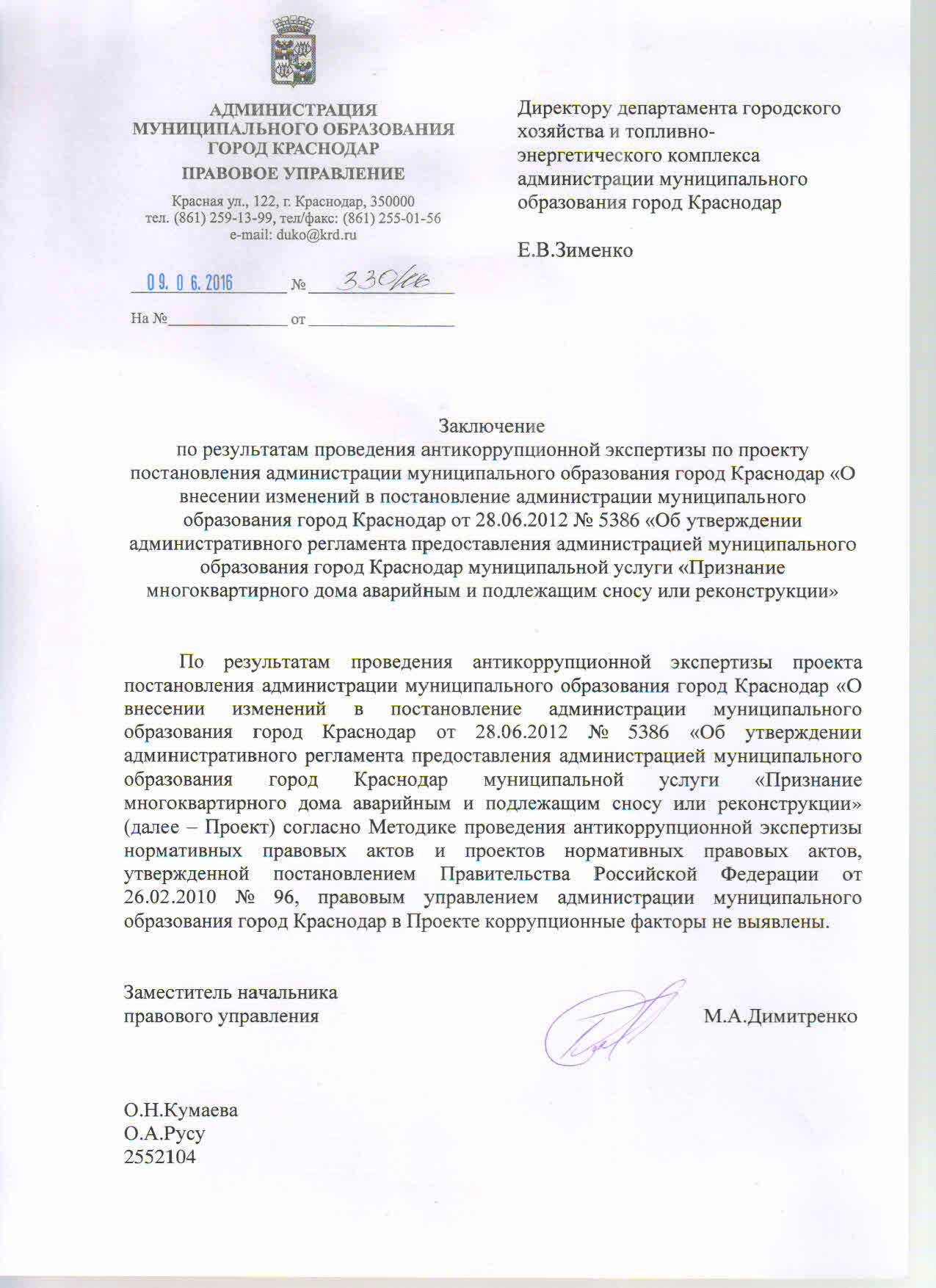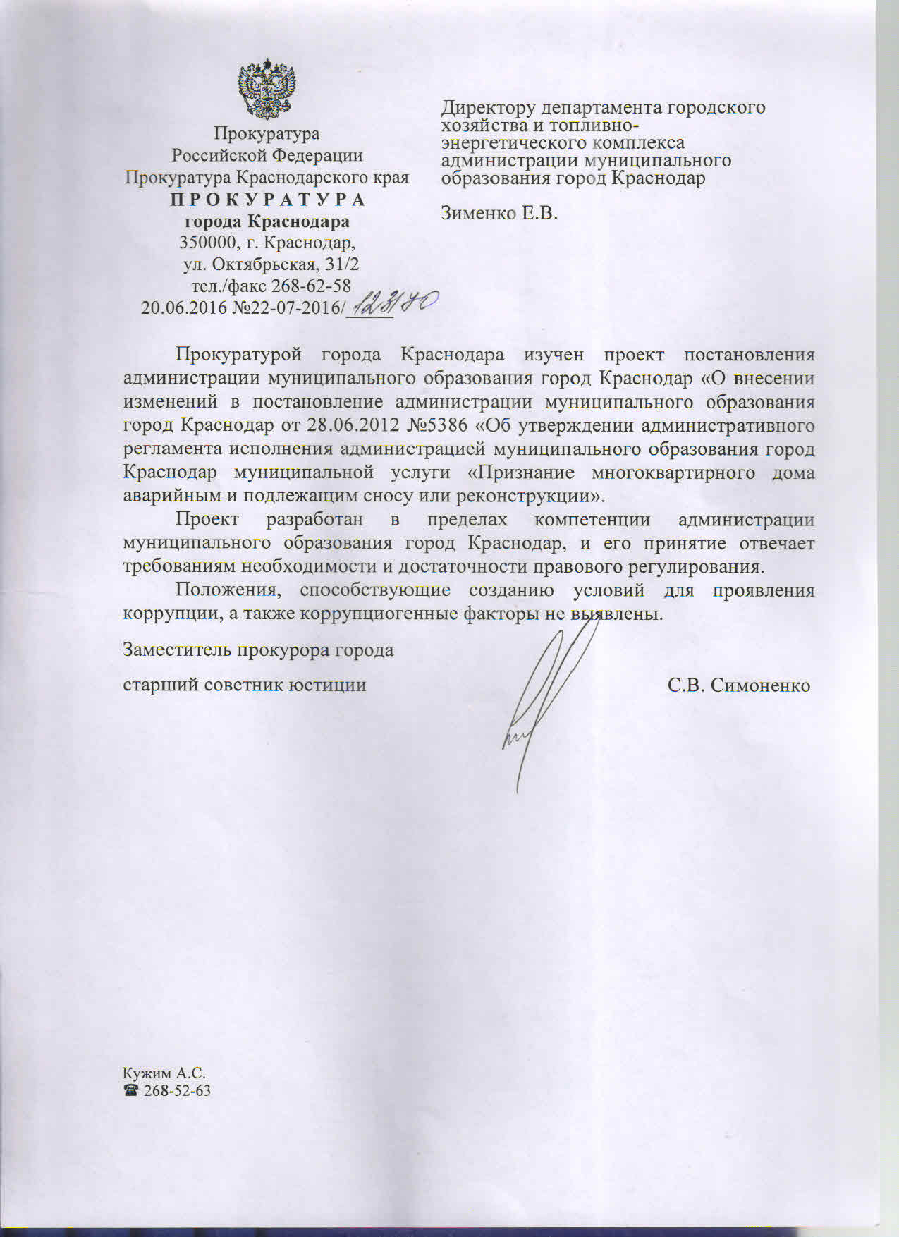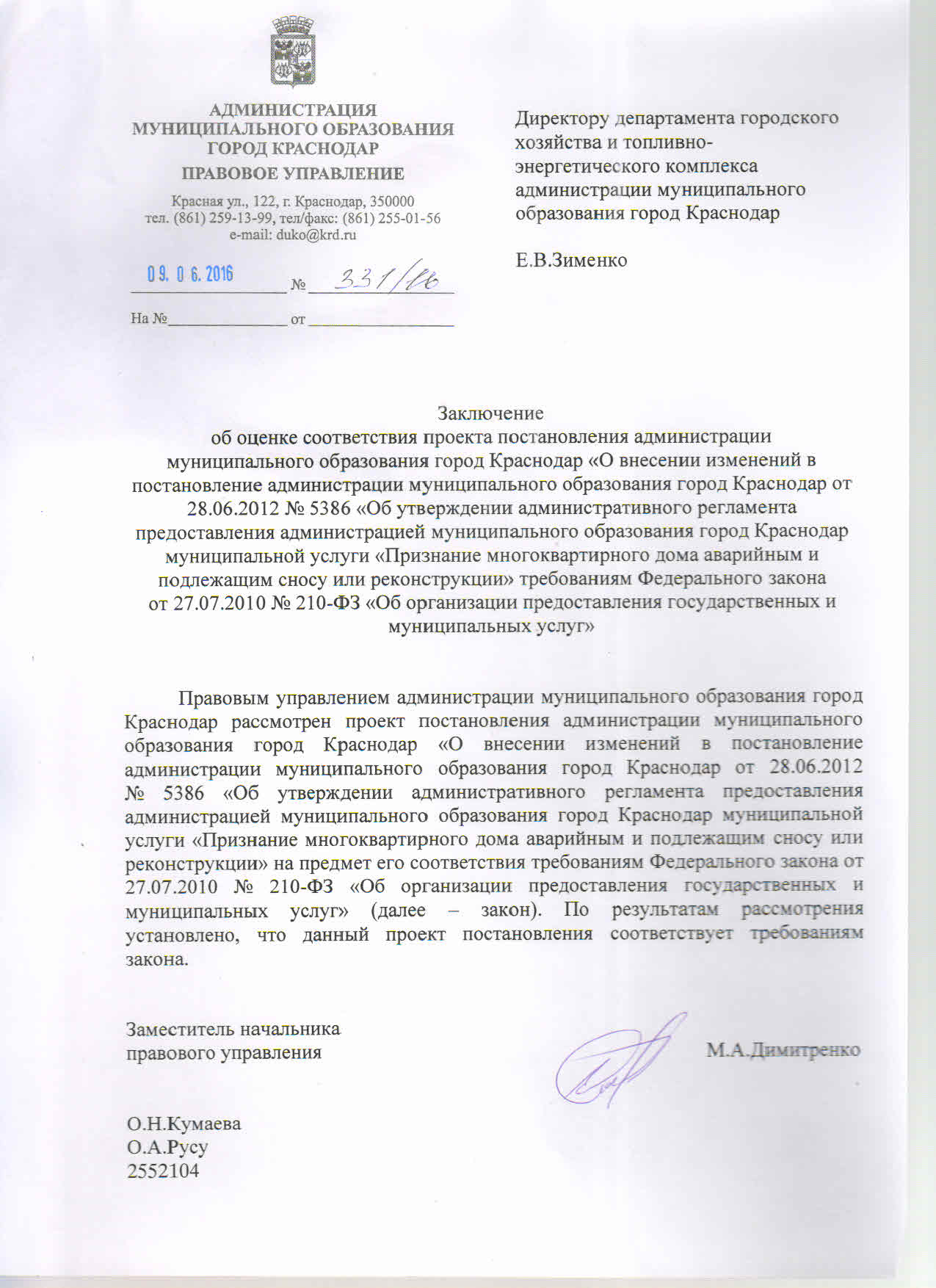 Постановление администрации муниципального образования город Краснодар от 29.06.2016г. № 2692 О внесении изменений в постановление администрации муниципального образования город Краснодар от 28.06.2012 № 5386 «Об утверждении административного регламента предоставления администрацией муниципального образования город Краснодар муниципальной услуги «Признание многоквартирного дома аварийным и подлежащим сносу или реконструкции»