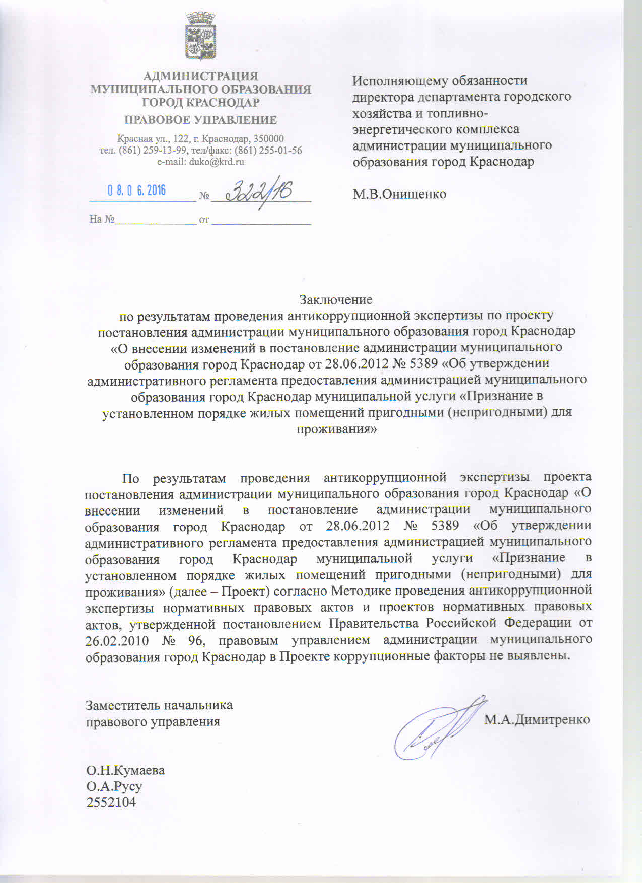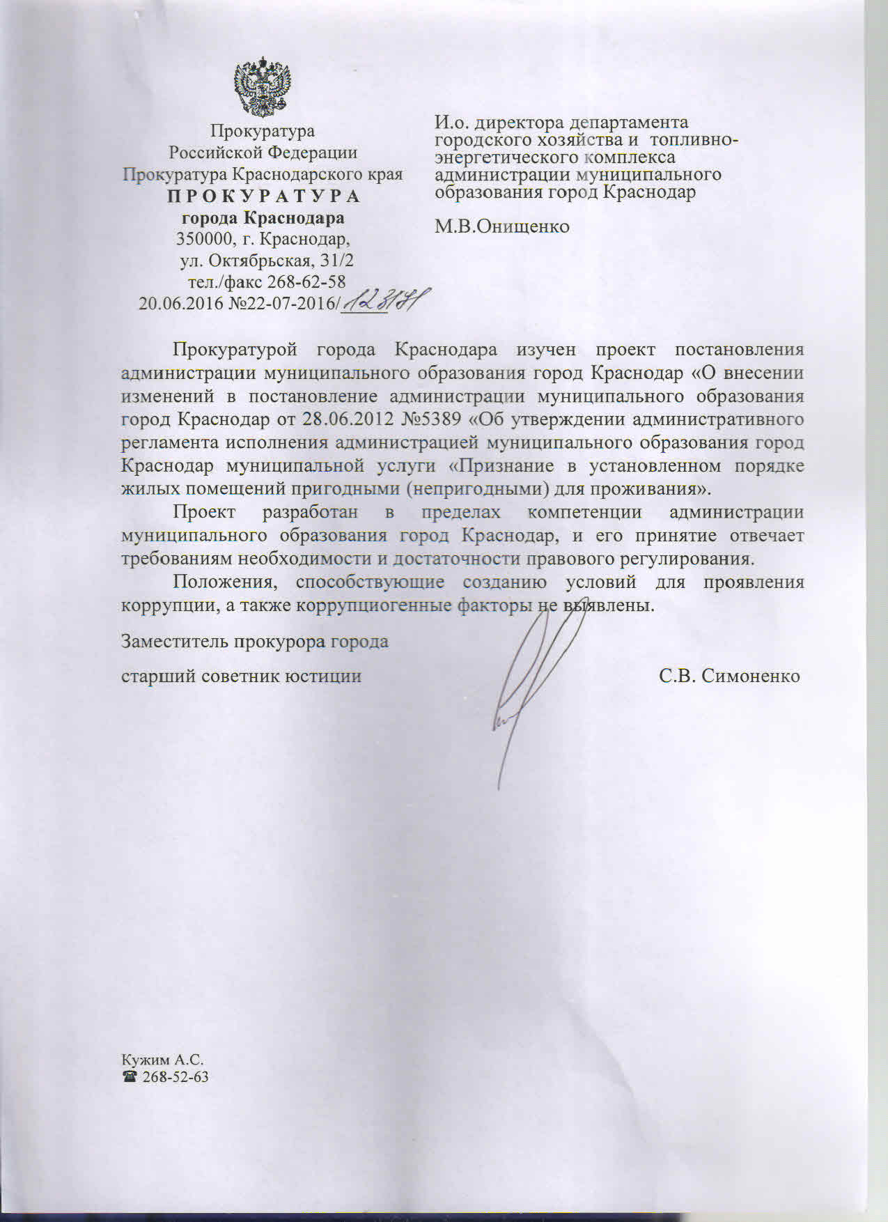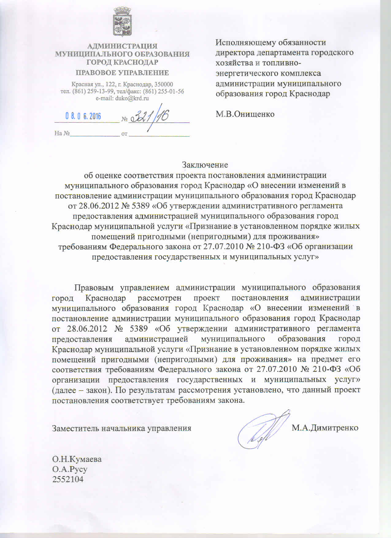Постановление администрации муниципального образования город Краснодар от 29.06.2016г. № 2695 О внесении изменений в постановление администрации муниципального образования город Краснодар от 28.06.2012 № 5389 «Об утверждении административного регламента предоставления администрацией муниципального образования город Краснодар муниципальной услуги «Признание в установленном порядке жилых помещений пригодными (непригодными) для проживания»