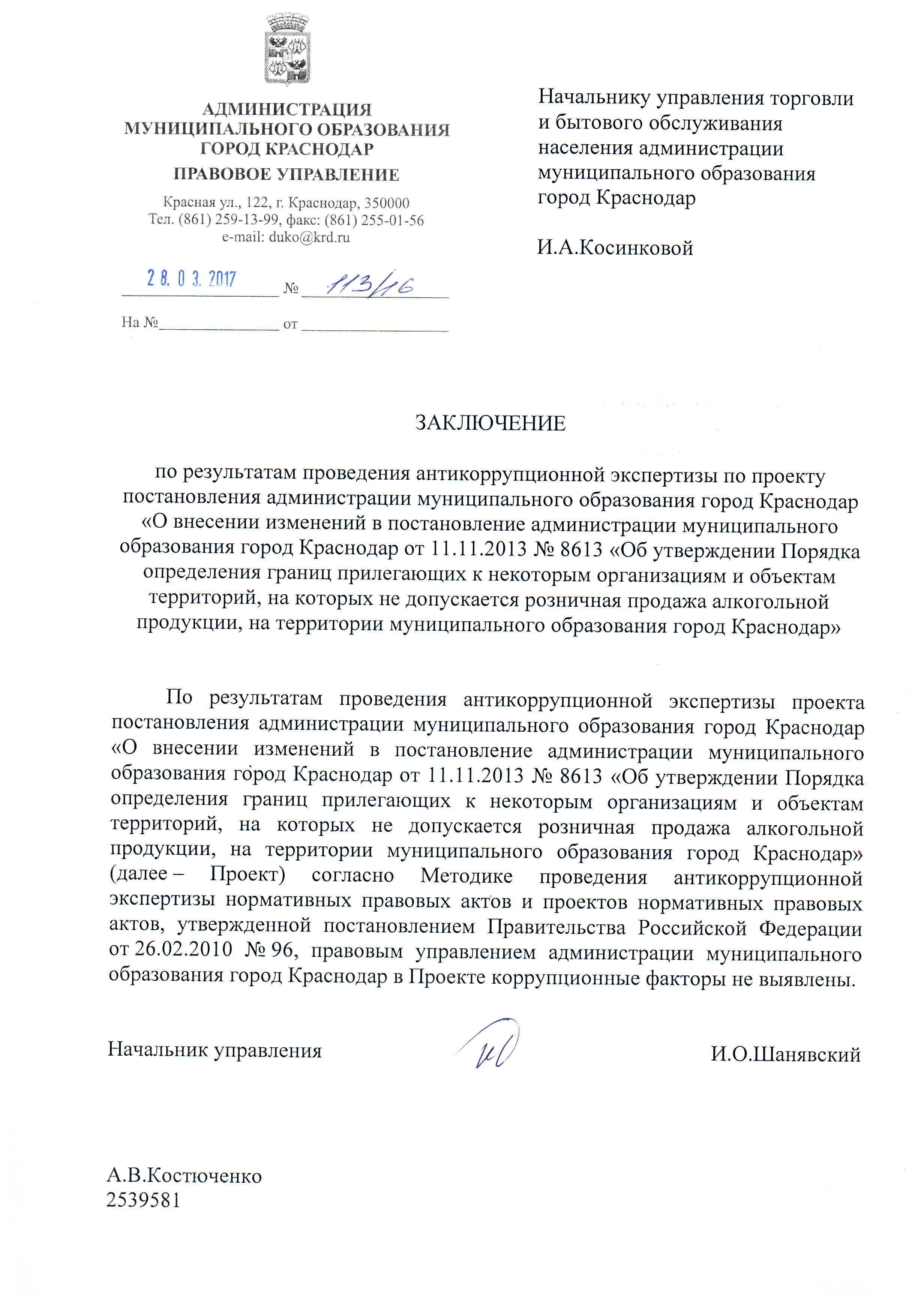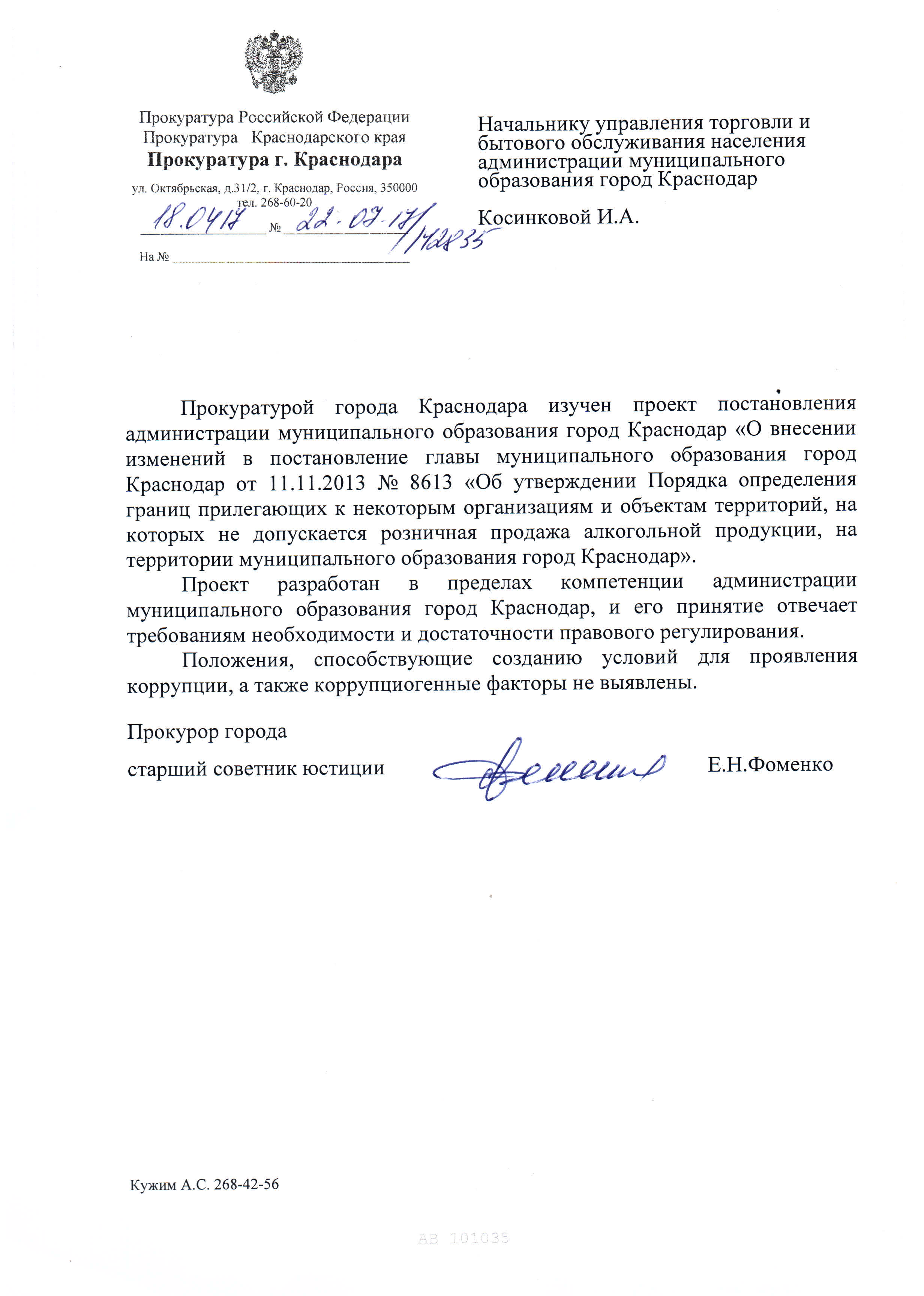 Проект постановления администрации муниципального образования город Краснодар О внесении изменений в постановление администрации муниципального образования город Краснодар от 11.11.2013 № 8613 «Об утверждении Порядка определения границ прилегающих к некоторым организациям и объектам территорий, на которых не допускается розничная продажа алкогольной продукции, на территории муниципального образования город Краснодар»