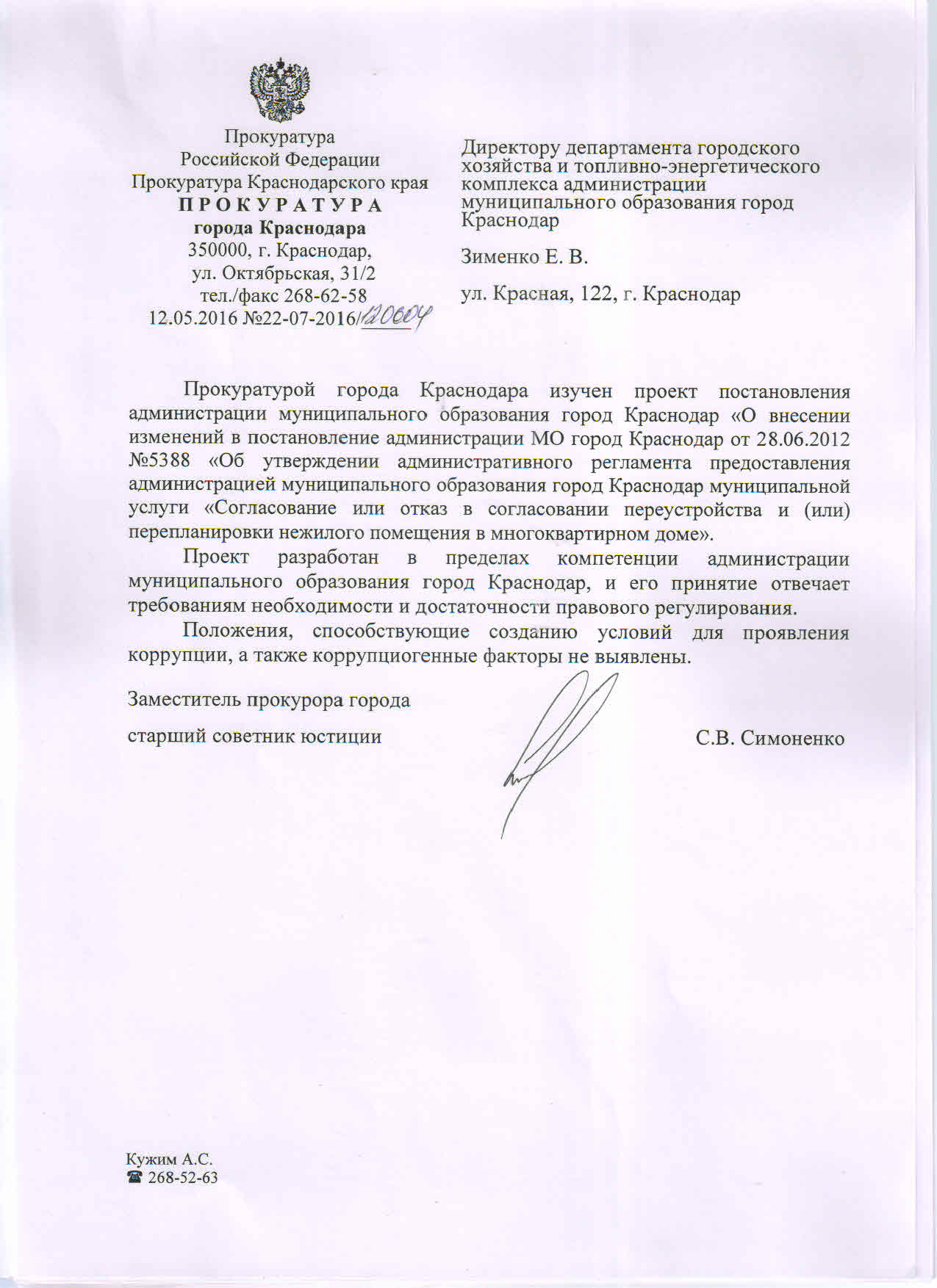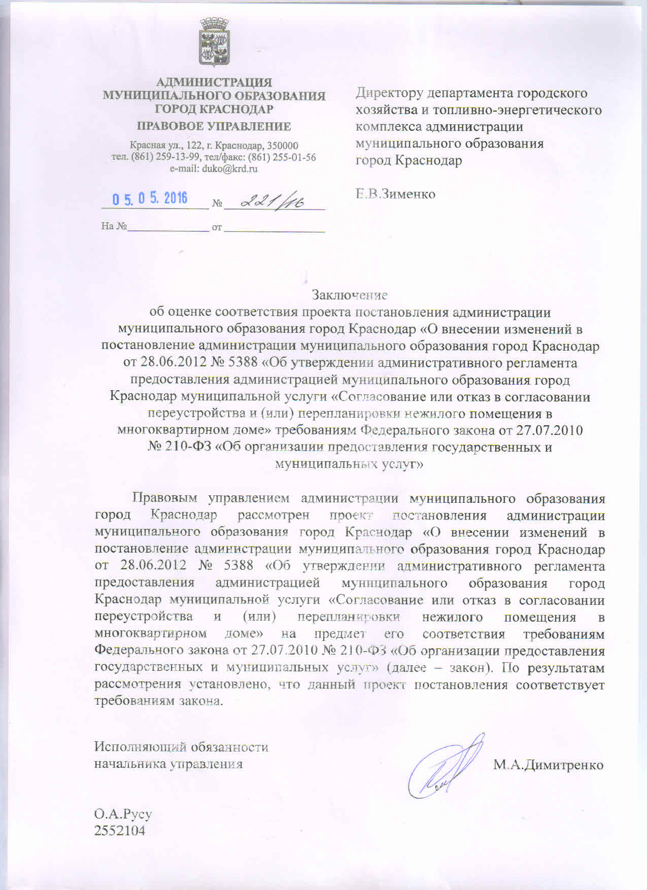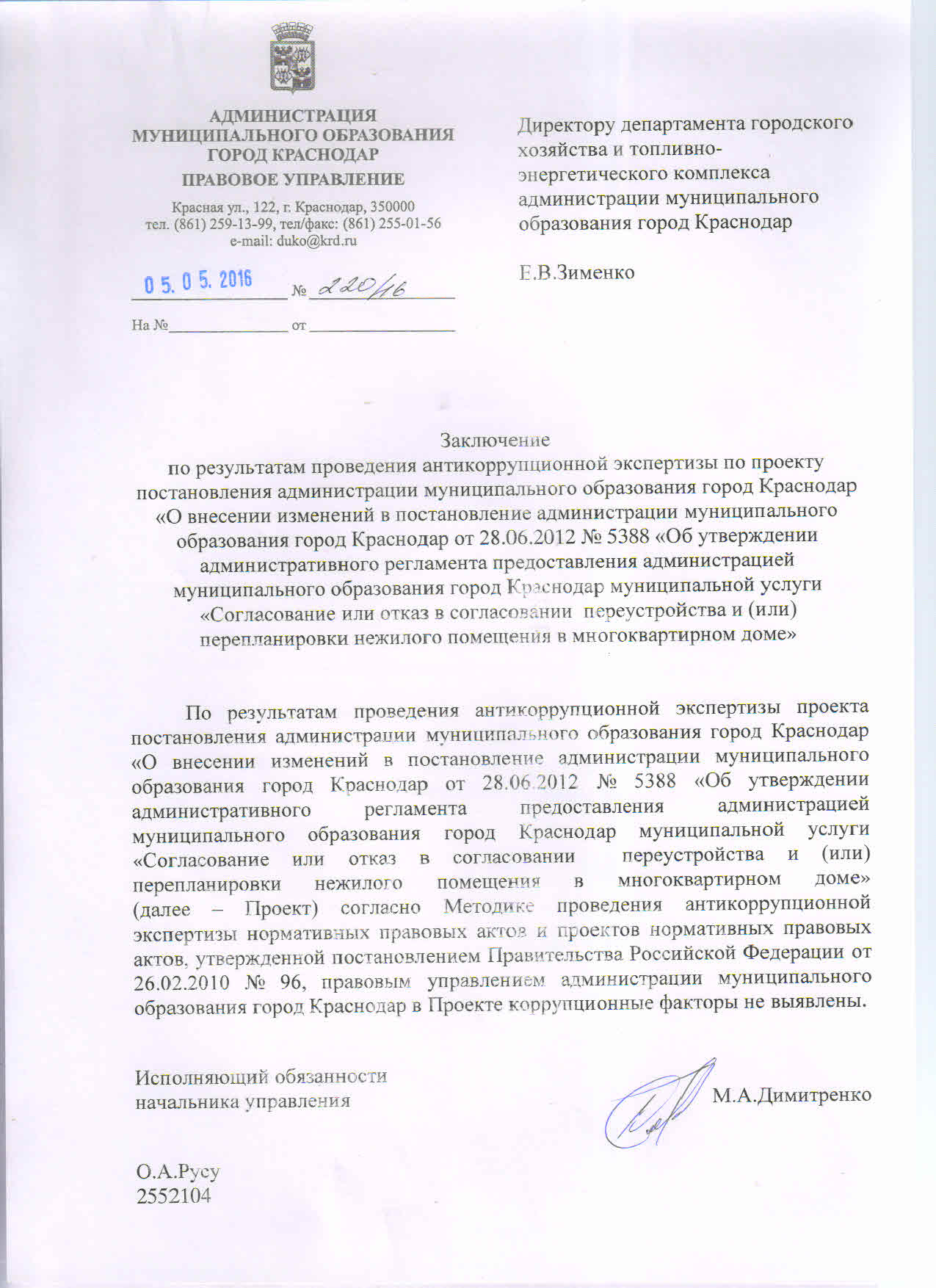 Постановление администрации муниципального образования город Краснодар от 23.05.2016г. № 2036 О внесении изменений в постановление администрации муниципального образования город Краснодар от 28.06.2012 № 5388 «Об утверждении административного регламента предоставления администрацией муниципального образования город Краснодар муниципальной услуги «Согласование или отказ в согласовании переустройства и (или) перепланировки нежилого помещения в многоквартирном доме»