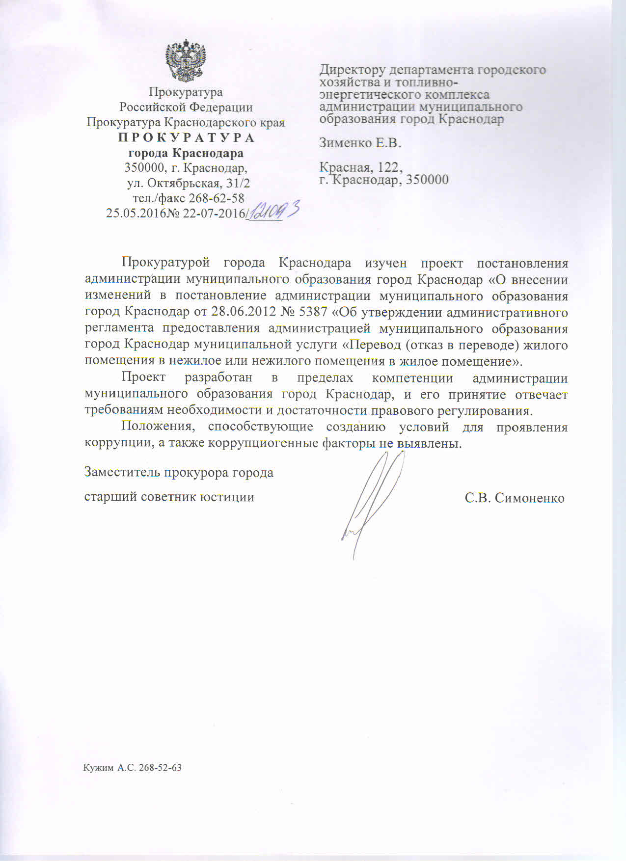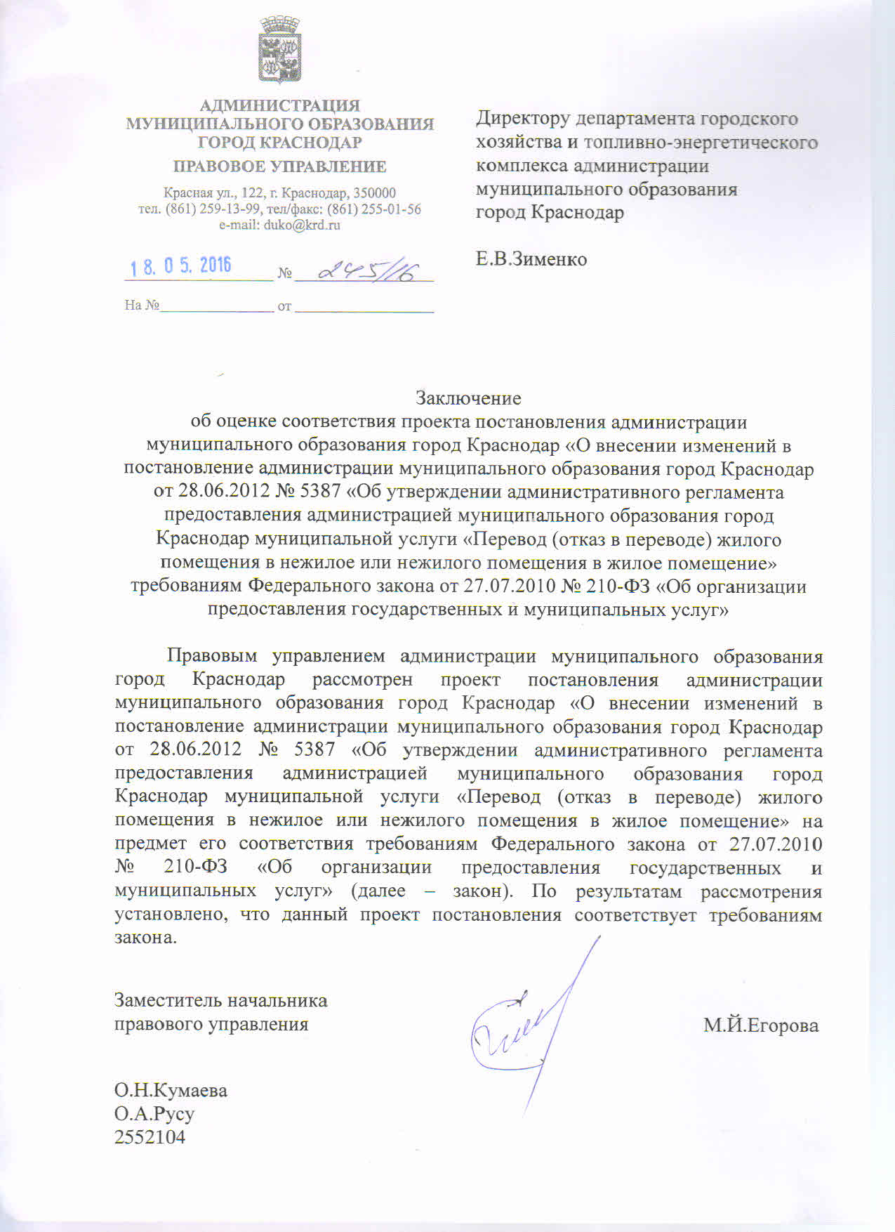 Постановление администрации муниципального образования город Краснодар от 31.05.2016г. № 2227 О внесении изменений в постановление администрации муниципального образования город Краснодар от 28.06.2012 № 5387 «Об утверждении административного регламента предоставления администрацией муниципального образования город Краснодар муниципальной услуги «Перевод (отказ в переводе) жилого помещения в нежилое или нежилого помещения в жилое помещение»
