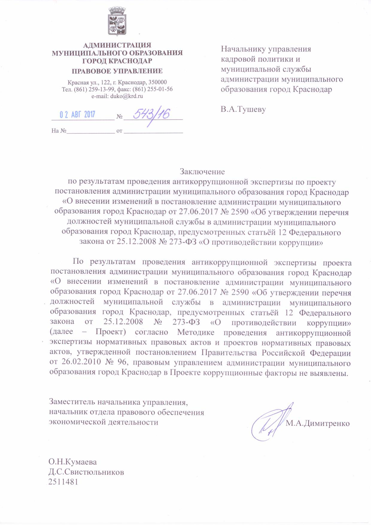 Проект постановления администрации муниципального образования город Краснодар О внесении изменений в постановление администрации муниципального образования город Краснодар от 27.06.2017 № 2590 «Об утверждении перечня должностей муниципальной службы в администрации муниципального образования город Краснодар, предусмотренных статьёй 12 Федерального закона от 25.12.2008 № 273-ФЗ «О противодействии коррупции»