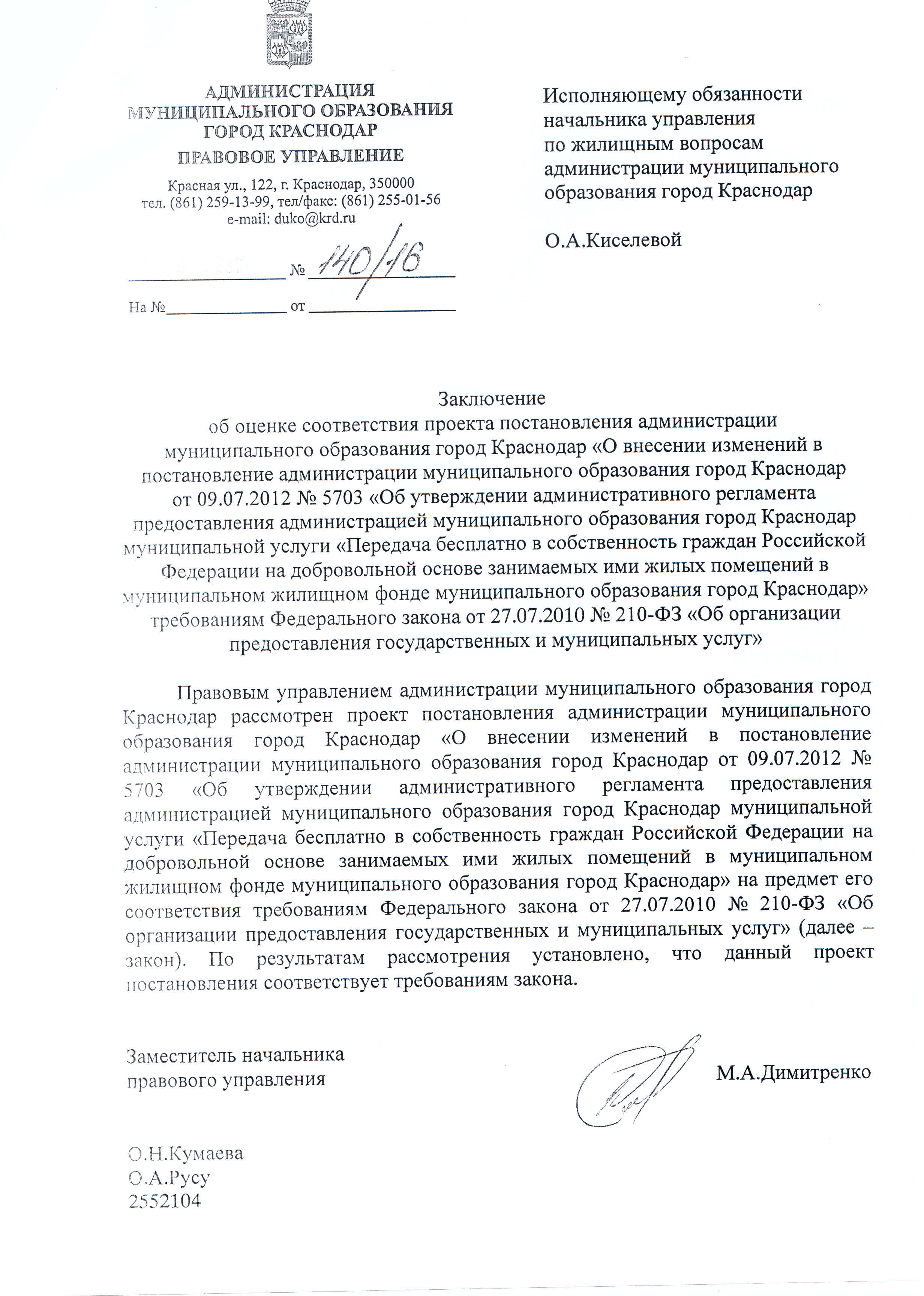 Постановления администрации муниципального образования город Краснодар от 04.05.2016 № 1707 «О внесении изменений в постановление админи-страции муниципального образования город Краснодар от 09.07.2012 № 5703 «Об утверждении административного регламента предоставления администрацией муниципального образования город Краснодар муниципальной услуги «Передача бесплатно в собственность граждан Российской Федерации на добровольной основе занимаемых ими жилых помещений в муниципальном жилищном фонде муниципального образования город Краснодар»