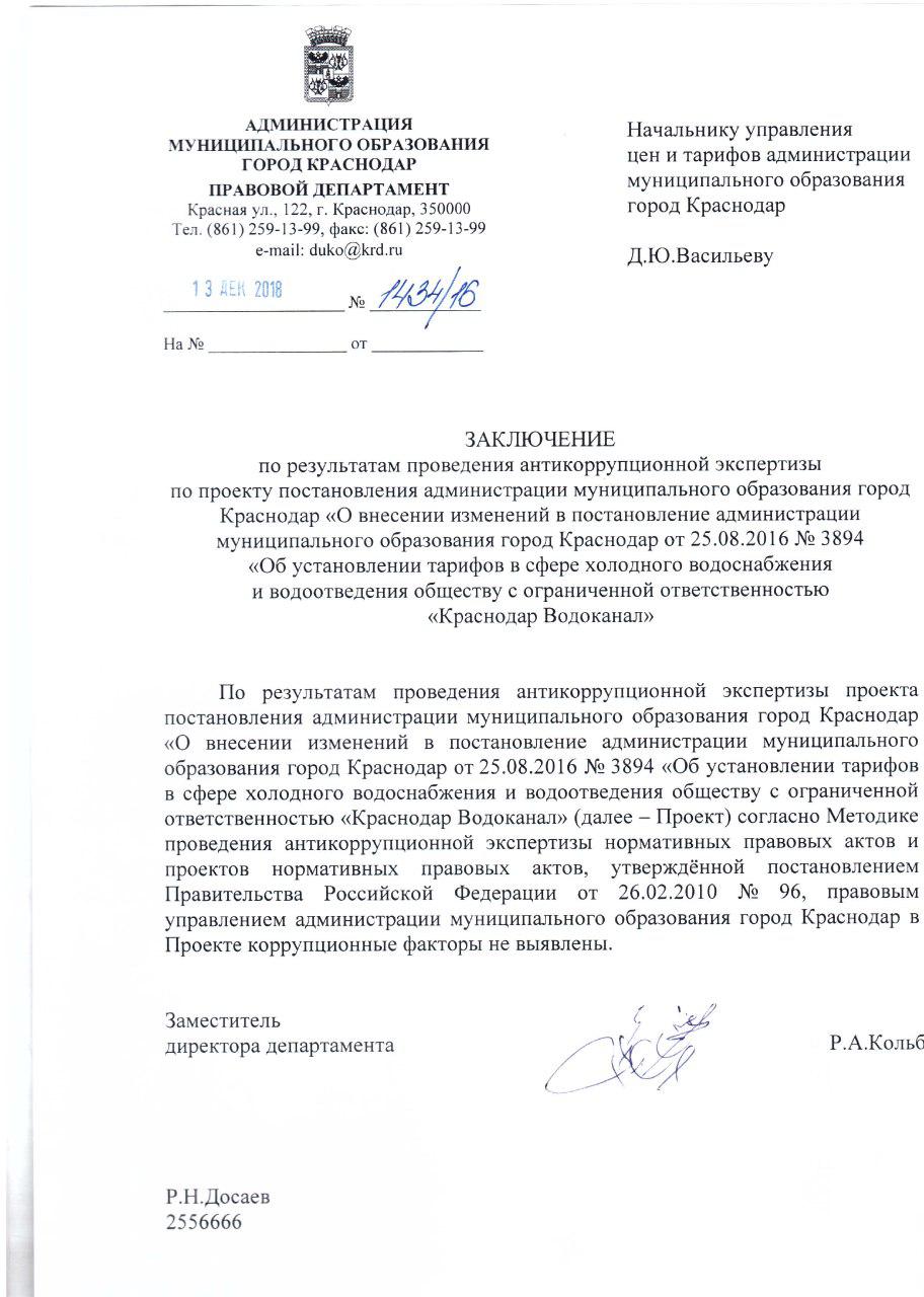 Проект постановления администрации муниципального образования город Краснодар О внесении изменений в постановление администрации муниципального образования город Краснодар от 25.08.2016 № 3894 «Об установлении тарифов в сфере холодного водоснабжения и водоотведения обществу с ограниченной ответственностью «Краснодар Водоканал»