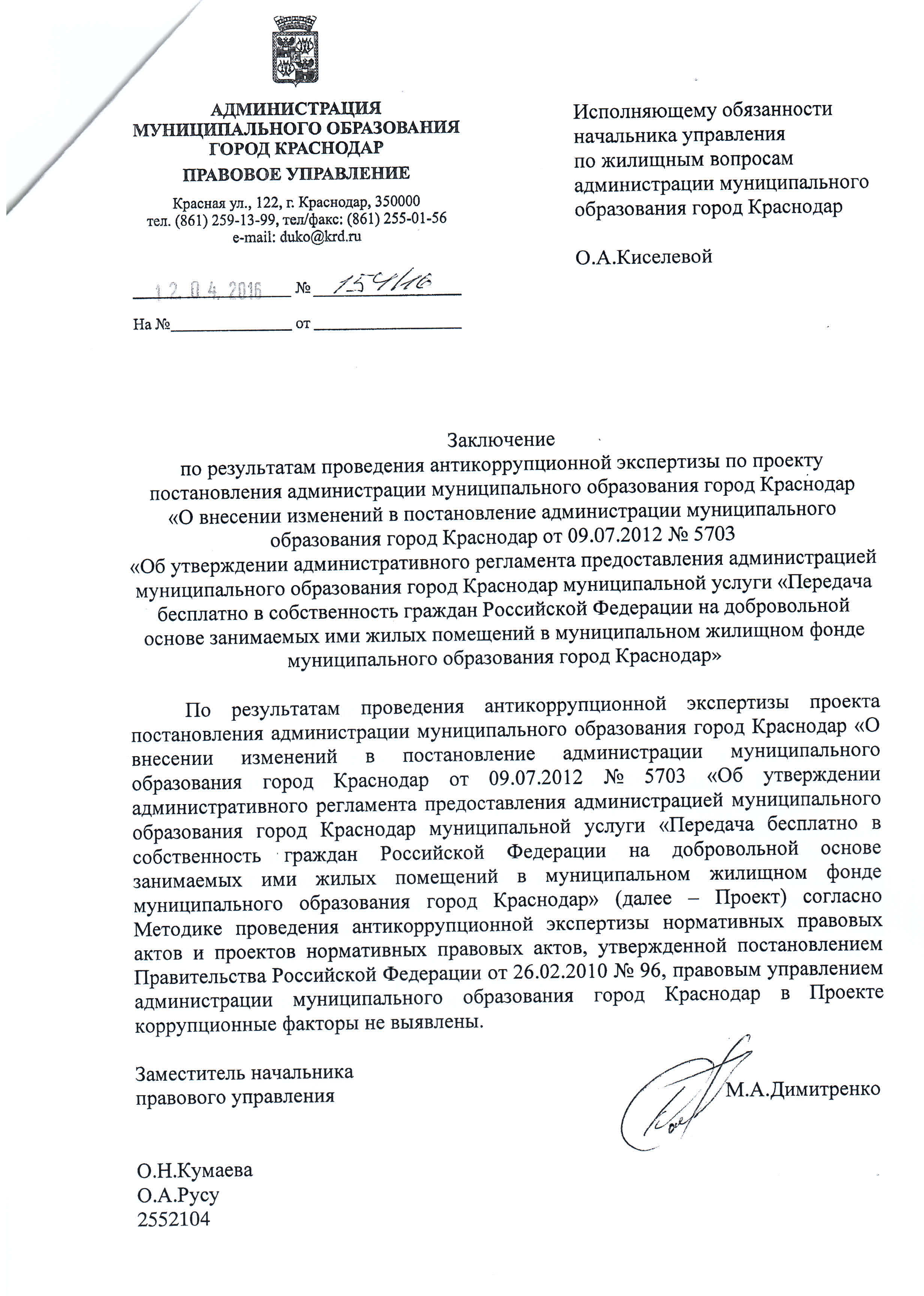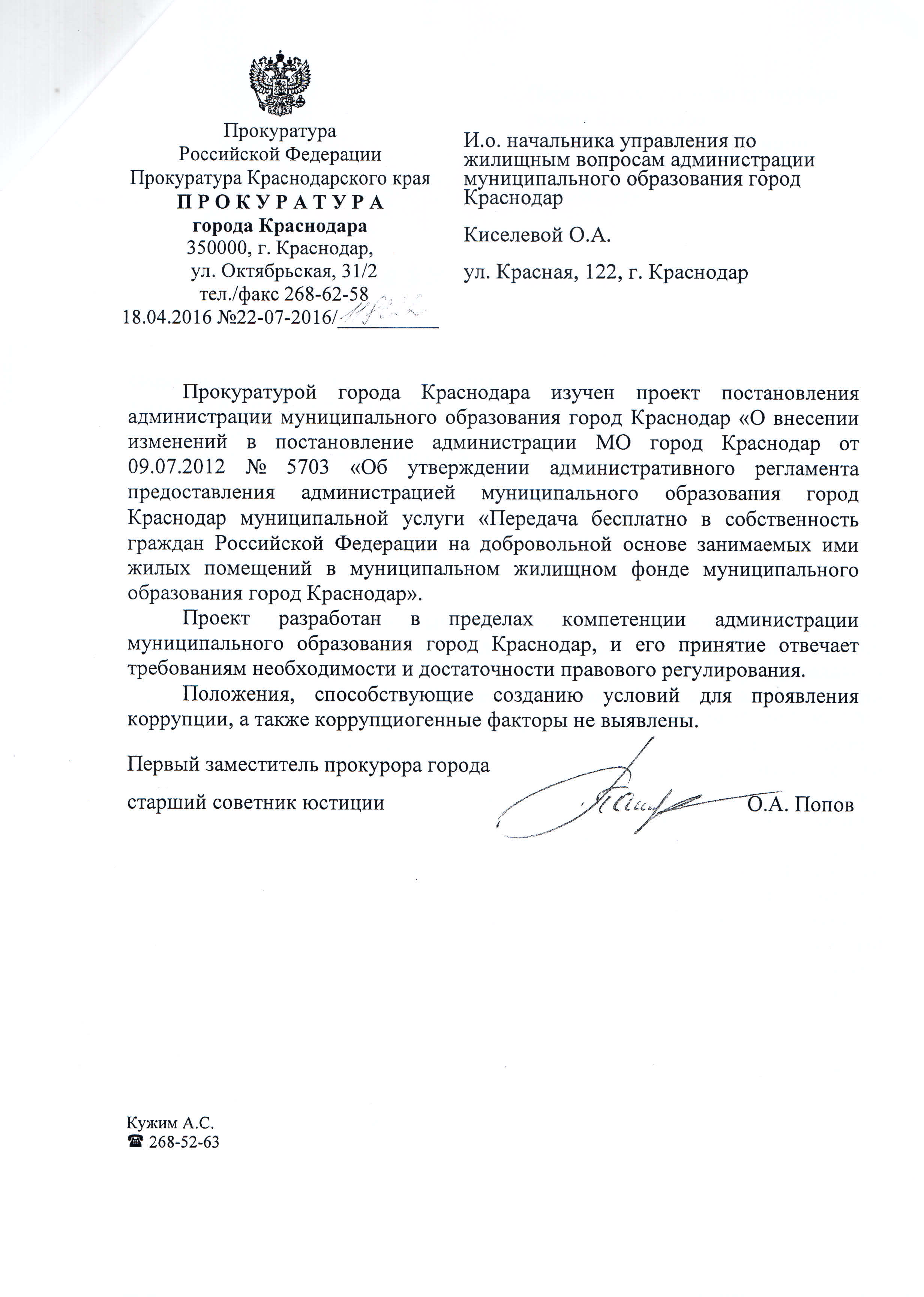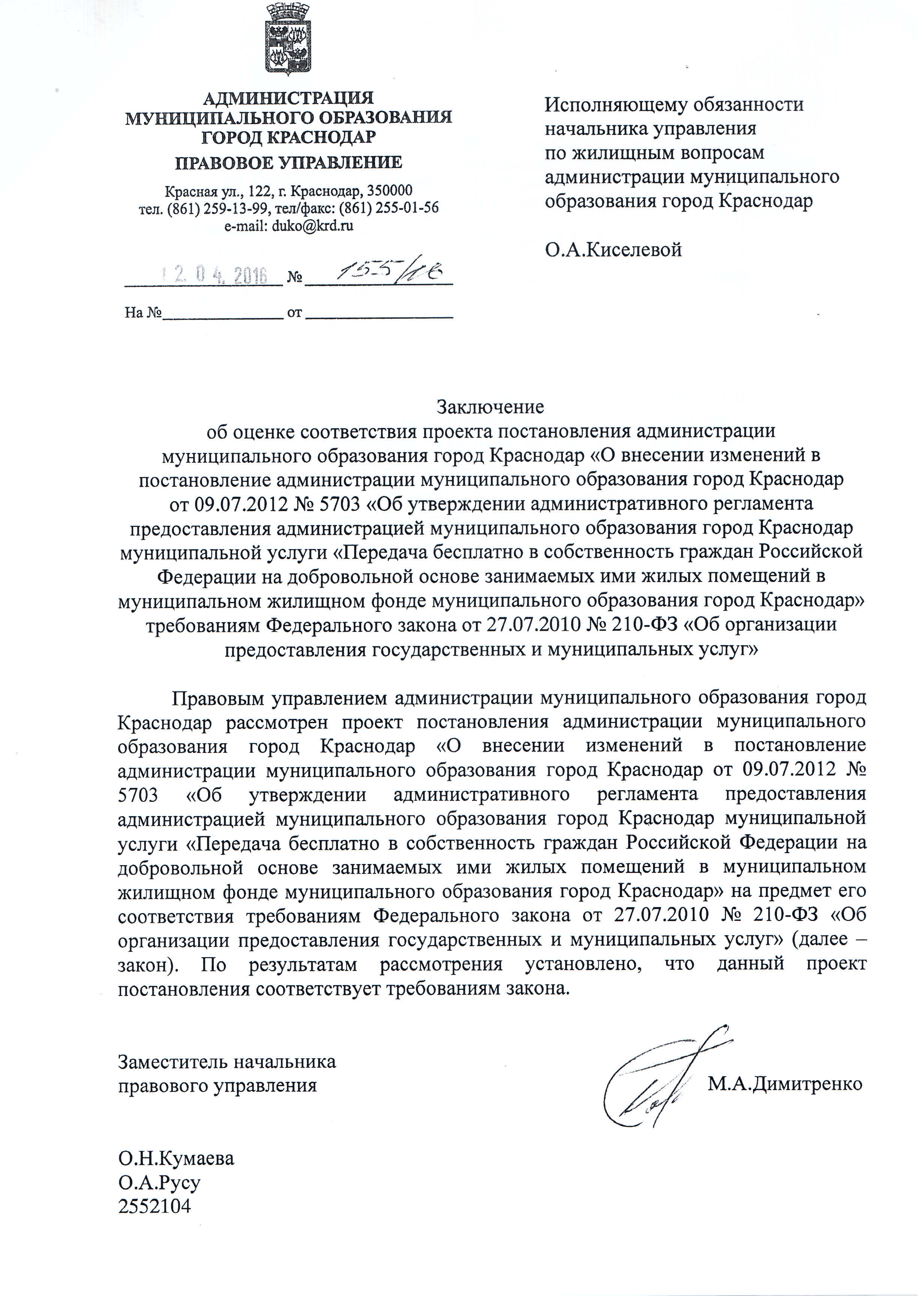 Постановления администрации муниципального образования город Краснодар от 16.05.2016г. № 1908 О внесении изменений в постановление администрации муниципального образования город Краснодар от 09.07.2012 № 5703 «Об утверждении административного регламента предоставления администрацией муниципального образования город Краснодар муниципальной услуги «Передача бесплатно в собственность граждан Российской Федерации на добровольной основе занимаемых ими жилых помещений в муниципальном жилищном фонде муниципального образования город Краснодар»