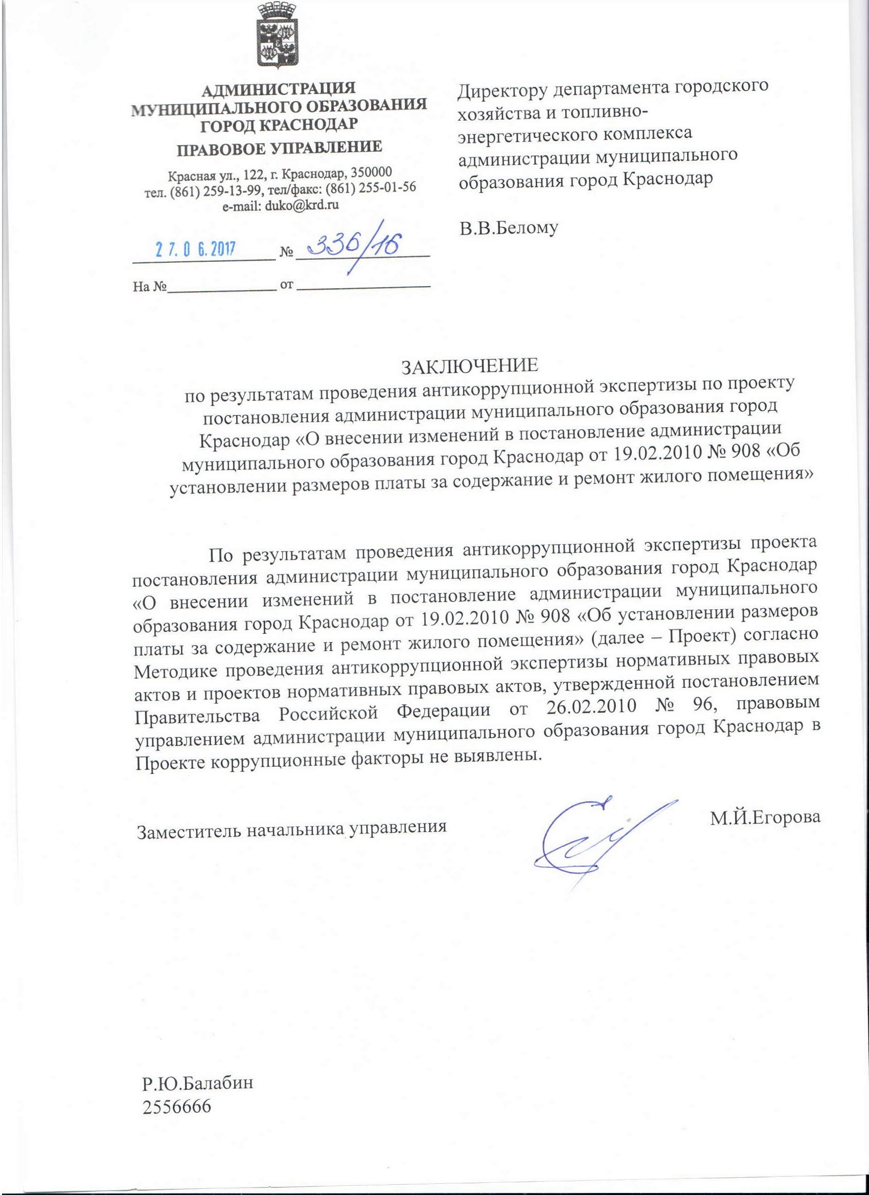 Проект постановления администрации муниципального образования город Краснодар О внесении изменений в постановление администрации муниципального образования город Краснодар от 19.02.2010 № 908 «Об установлении размеров платы за содержание и ремонт жилого помещения»