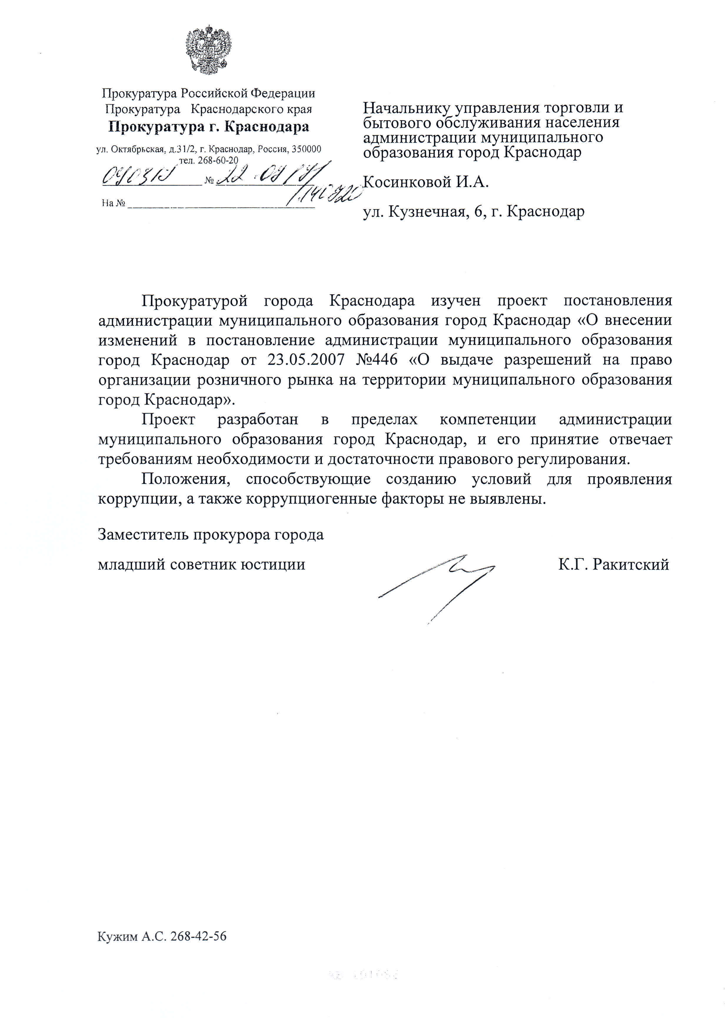 Постановление администрации муниципального образования город Краснодар от 20.03.2017 №1030 О внесении изменений в постановление главы муниципального образования город Краснодар от 23.05.2007 № 446 «О выдаче разрешений на право организации розничного рынка на территории муниципального образования город Краснодар»