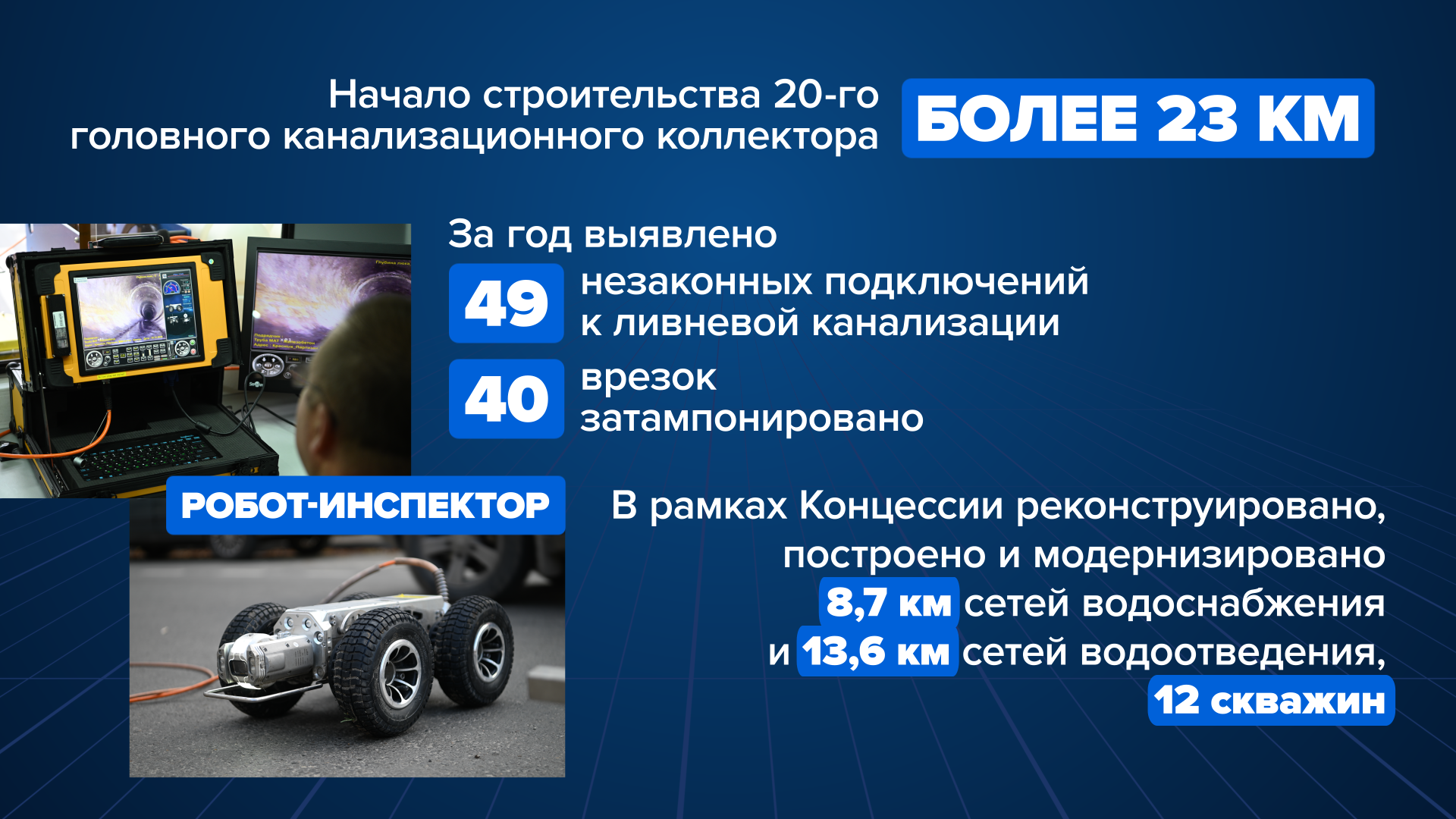 По инвестиционной программе построены две новые канализационные насосные станции, реконструированы две существующие станции, напорные сети водоснабжения, построен водопровод по территории «Города спорта».