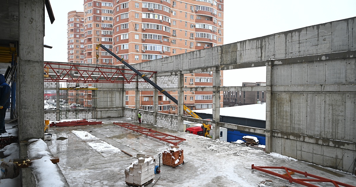 Строительство объекта выполнено на треть. Сейчас основные силы направлены на возведение монолитного каркаса будущего здания и подготовку к устройству кровли.