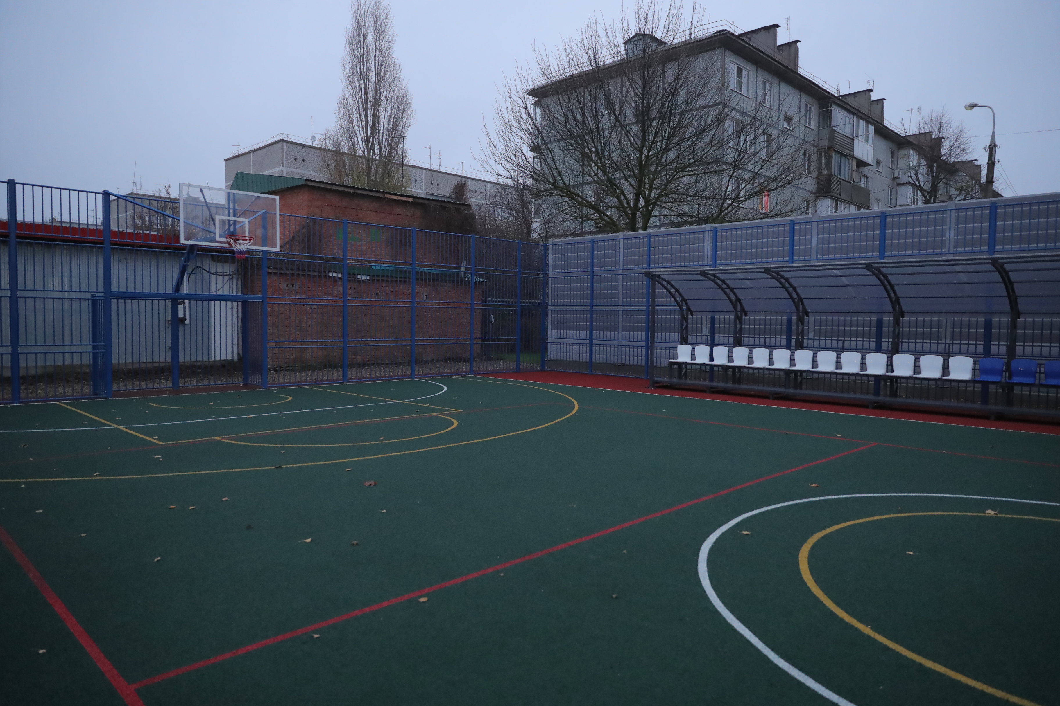 На всём объекте залили прочное бетонное основание. На площадке для футбола, волейбола и баскетбола уложили специальное покрытие, нанесли необходимую разметку, смонтировали ограждения и зрительские трибуны. Также рядом установили шумопоглощающие экраны.