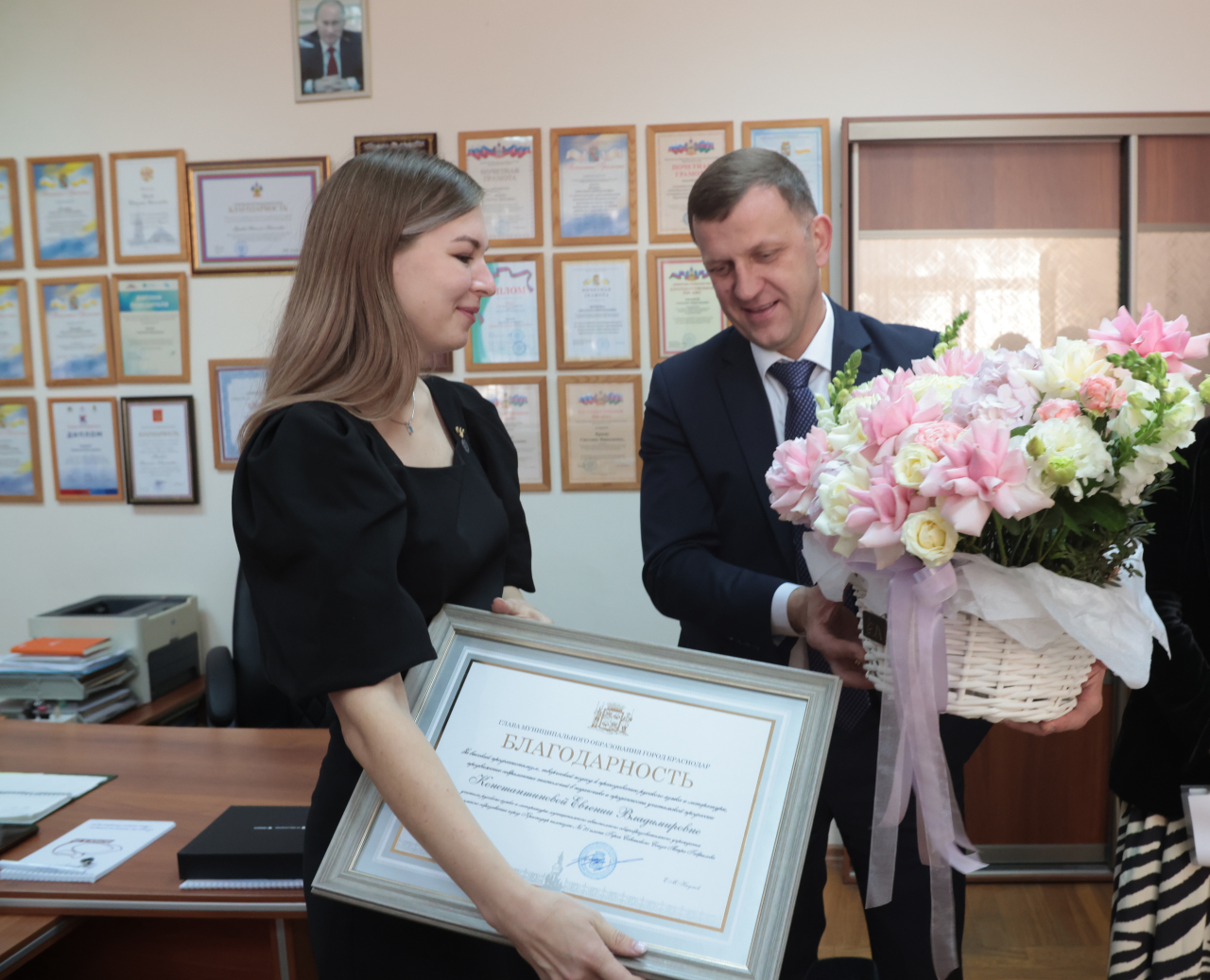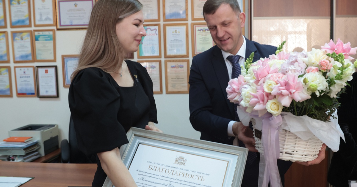 По итогам Всероссийского конкурса Евгения Владимировна вошла в число 15 лучших учителей страны. Вместе со своими учениками она развивает сообщество по изучению русского языка в социальных сетях. Вступить в него пригласили и главу кубанской столицы — преподаватель вручила ему специальный значок.