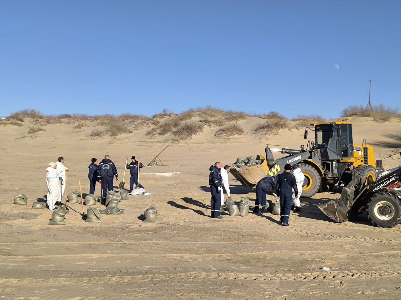 Спасатели и волонтеры вновь обходили береговую линию вдоль Пионерского проспекта в сторону центра Анапы. Вручную и механизированным способом собирали загрязненный песок, грузили в самосвалы для вывоза на полигон в х. Воскресенский.