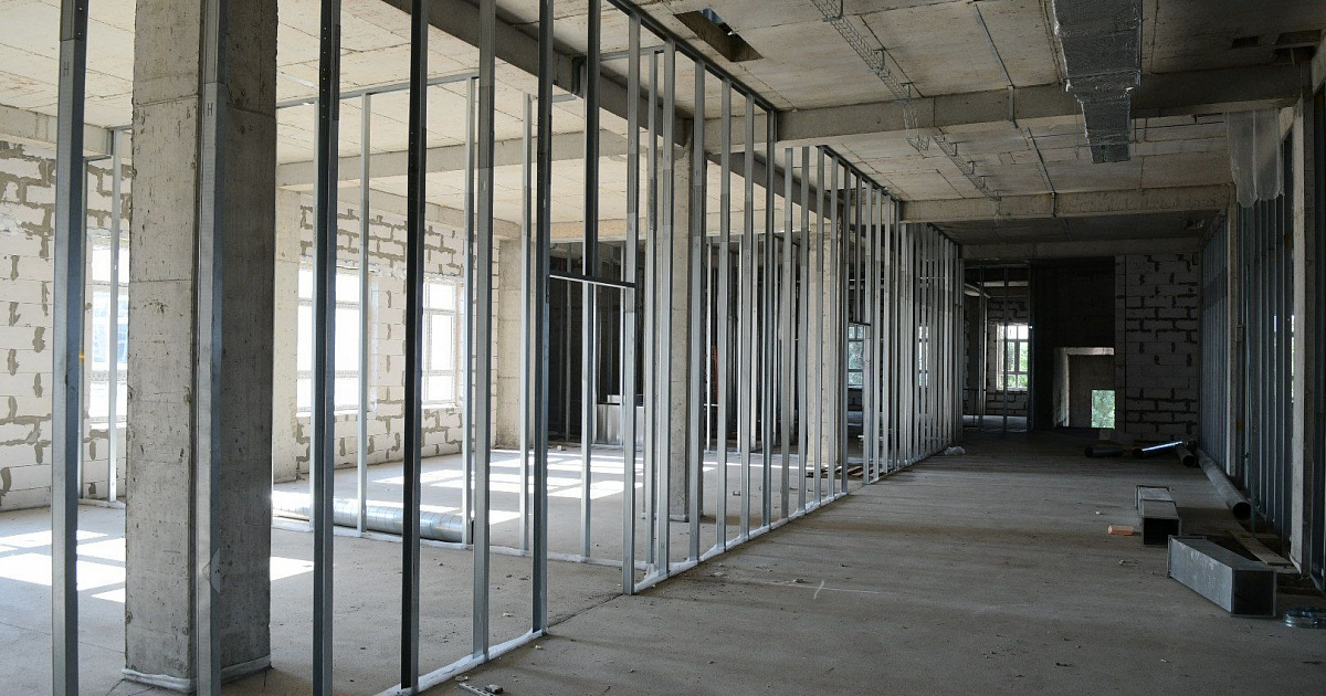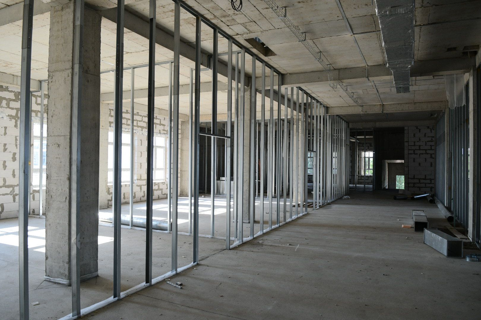 Сейчас идет прокладка инженерных коммуникаций. 130 рабочих и специалистов монтируют системы отопления, водоснабжения, канализации и электричества, делают фасад и кровлю, производят армирование парапетов. В одном из блоков здания уже стартовала внутренняя отделка.
