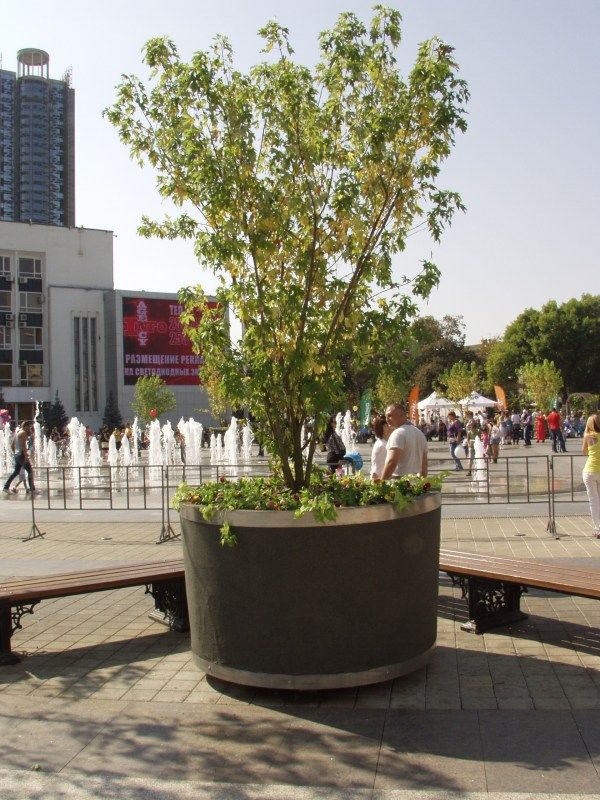 По периметру фонтана установлены большие вазоны с декоративными деревьями редкой породы «клен сахарный».