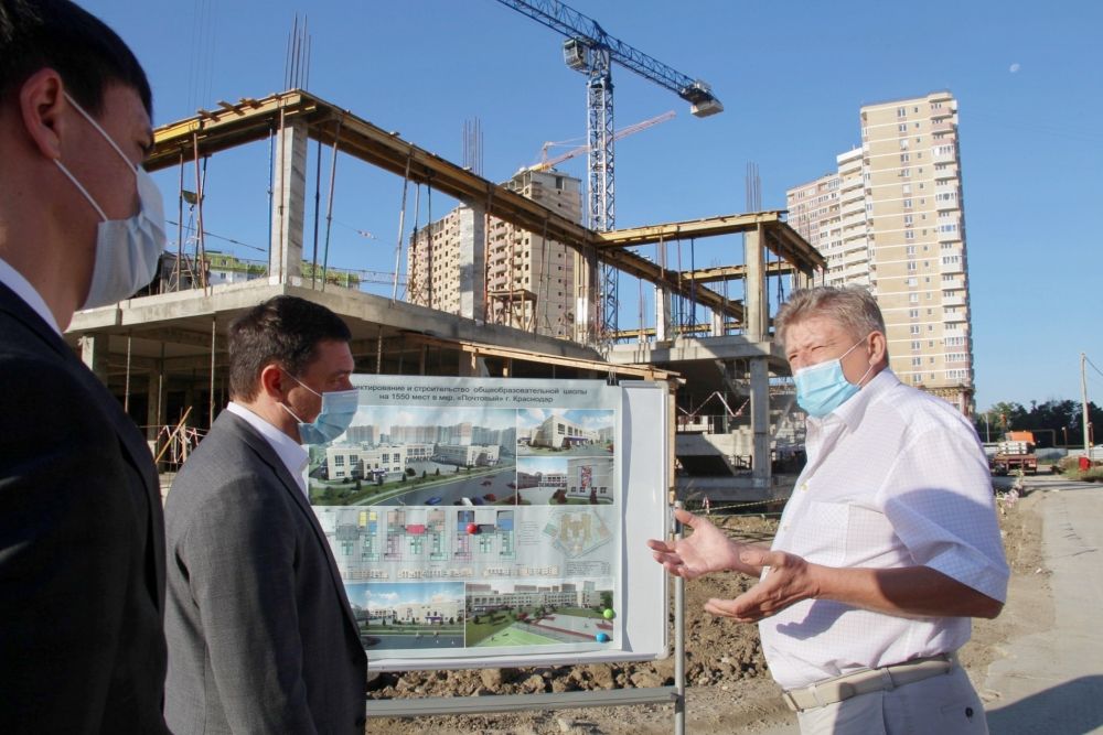 На стройплощадке образовательного учреждения на 1550 мест по ул. Автолюбителей, которая примет учеников в 2022 г., идут монолитные работы и подведение инженерных коммуникаций. Работают сразу два башенных крана, что позволяет равномерно выполнять работы сразу на всех блоках. Во время утреннего рабочего объезда ход работ проверил глава Краснодара Евгений Первышов.