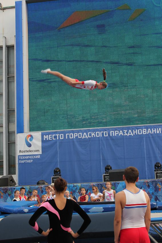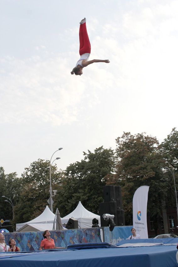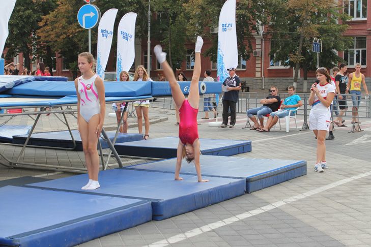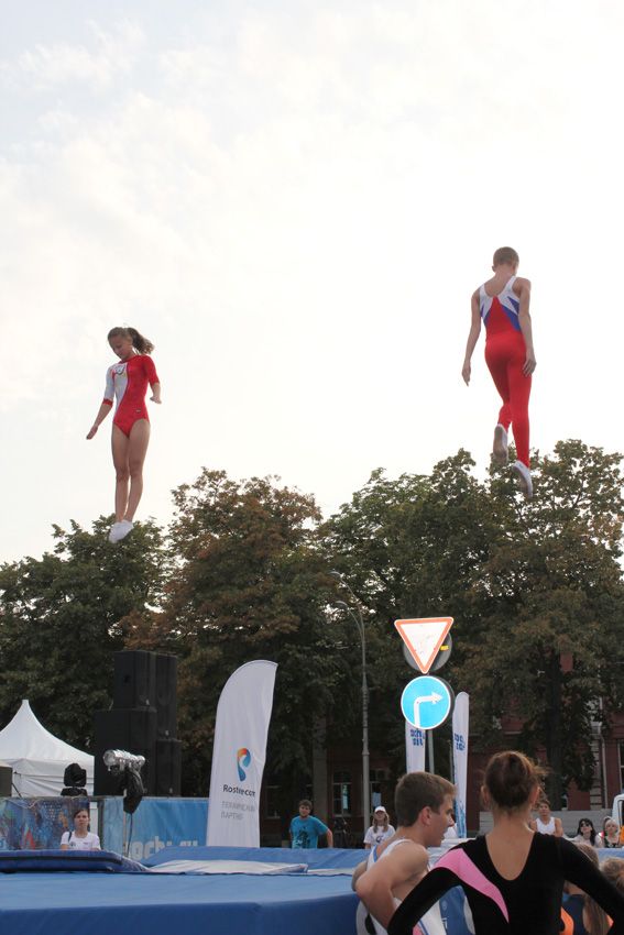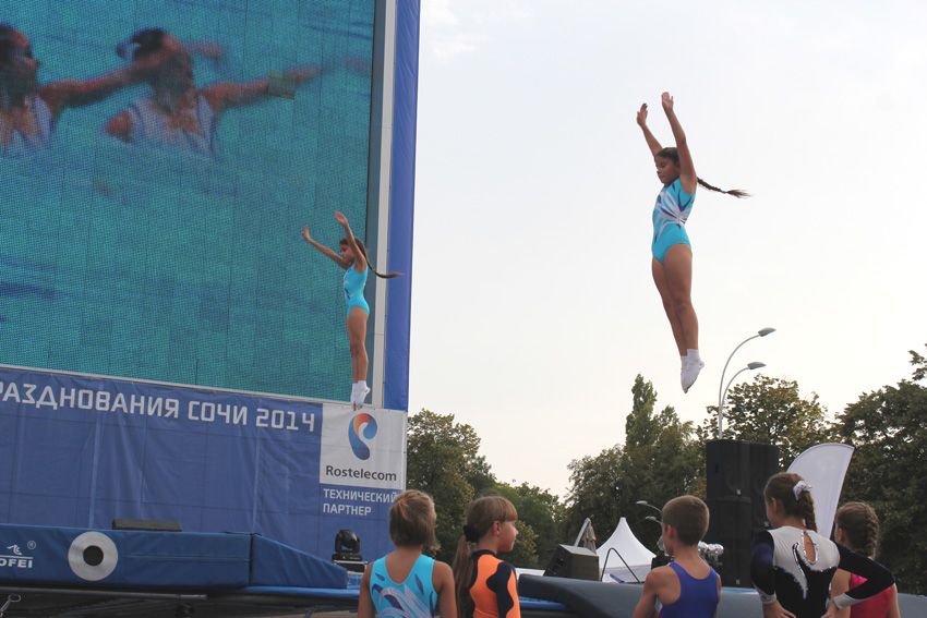 Помимо двух батутов, на площади оборудовали импровизированный тренировочный зал. Старший тренер-преподаватель Светлана Агафонова дала «открытый урок». А ее воспитанники старательно показали, как они разучивают комбинации и отрабатывают связки сложнейших элементов на земле и в воздухе.