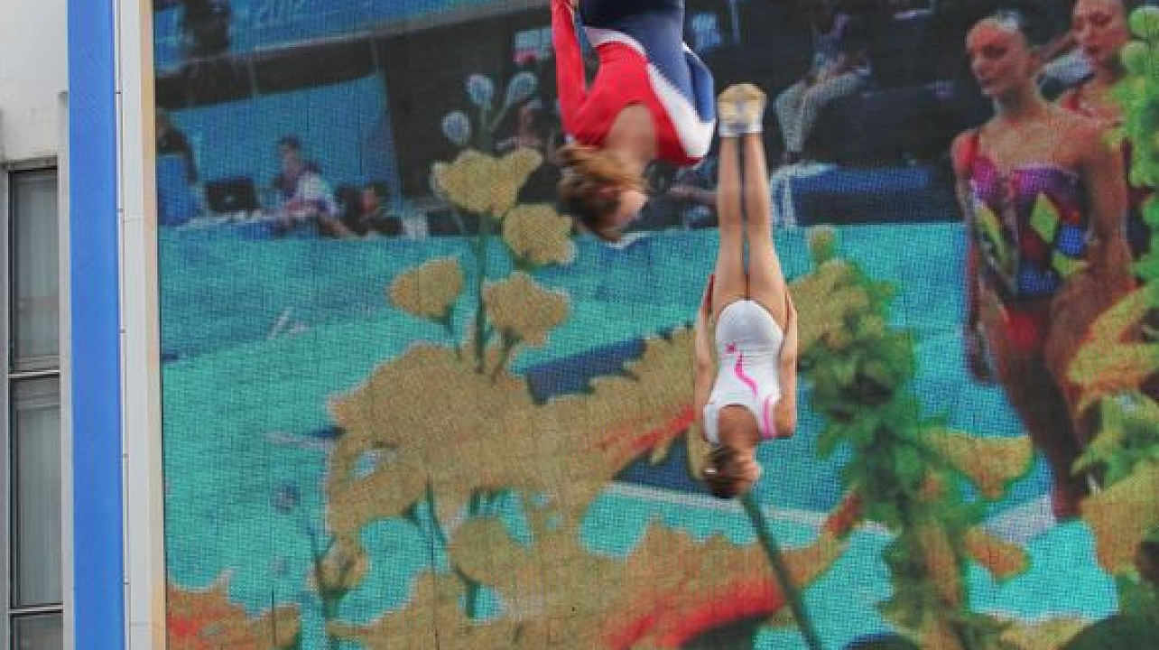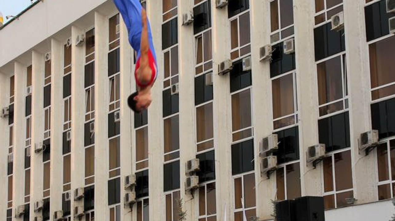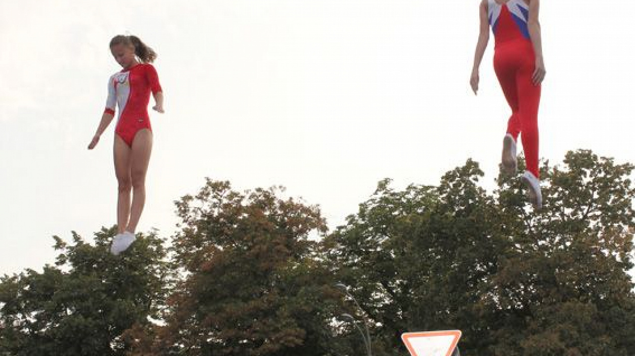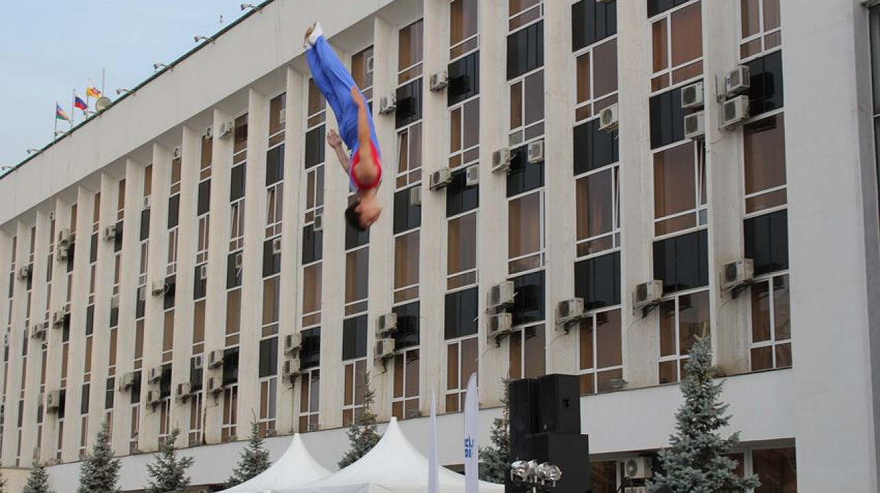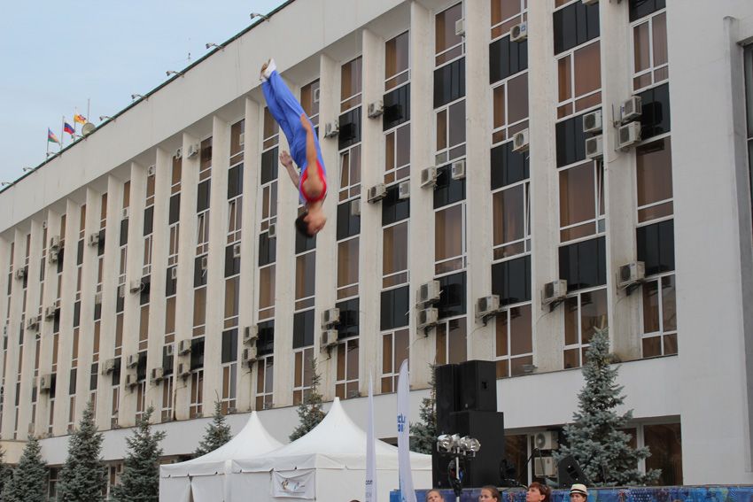 Гимнасты устроили полеты с выполнением сложнейших элементов в воздухе на Театральной площади.