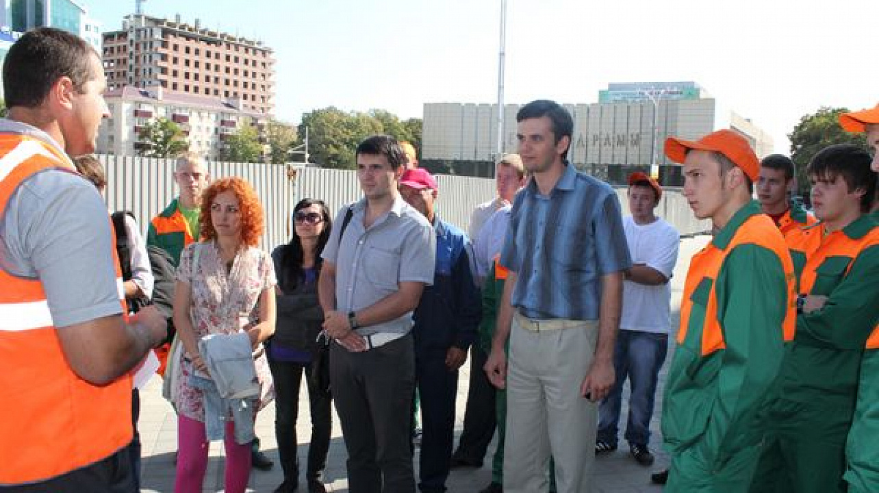 Руководитель проекта по реконструкции Театральной площади Андрей Жигулин провел для участников акции краткую экскурсию, рассказав на месте будущей чаши фонтана, каким предстанет перед глазами горожан и гостей краевой столицы самый большой светомузыкальный фонтан на Юге страны.