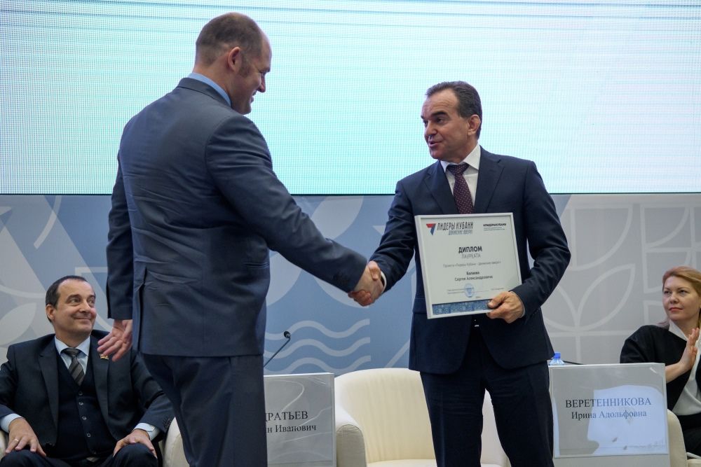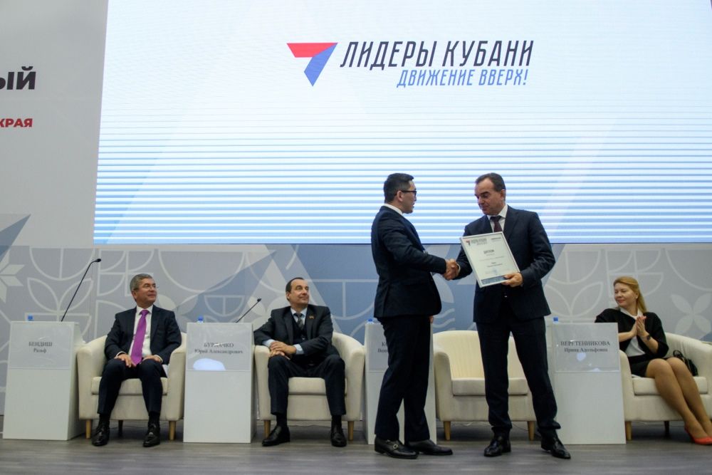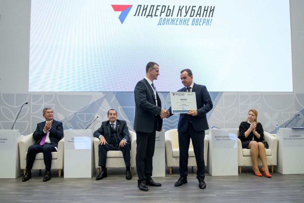 Завершилась панельная дискуссия церемонией награждения. В этом году среди 25 лауреатов и победителей конкурса «Лидеры Кубани — движение вверх!» — 10 краснодарцев. В их числе — глава Калининской сельской администрации Виталий Катунин.