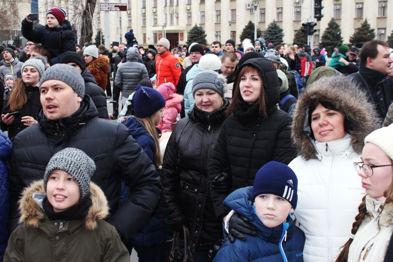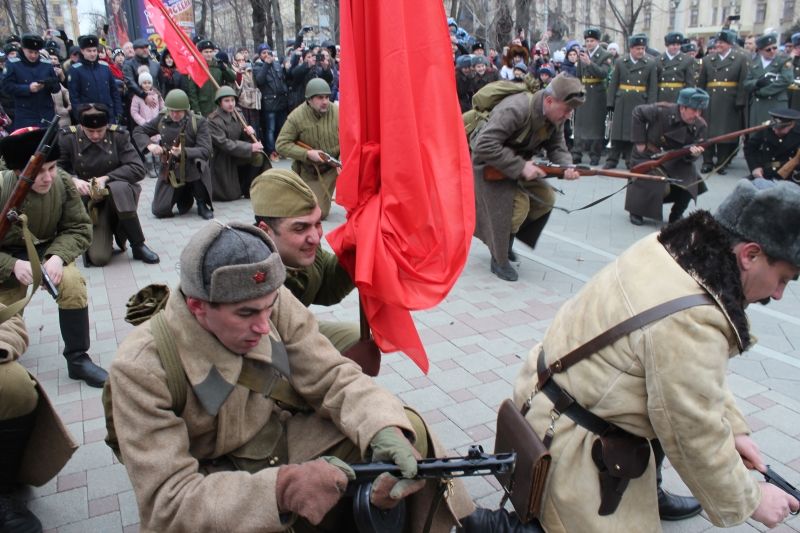 Представители молодежных патриотических клубов в точном обмундировании бойцов Красной армии образца 1940-х годов показали историческую реконструкцию событий 12 февраля 1943 года: из символического укрепления, разбитого прямо на аллее сквера, сводный отряд бойцов мотострелковой разведки под крики «Ура!» и выстрелы из миномета и пушки пробежал к бывшему зданию ВКП(Б) на углу ул. Гимназической и ул. Красной, затем представители молодежных патриотических клубов, изображая участников военных событий тех лет, подняли Красное Знамя размером 3 на 1, 5 м на балкон здания.