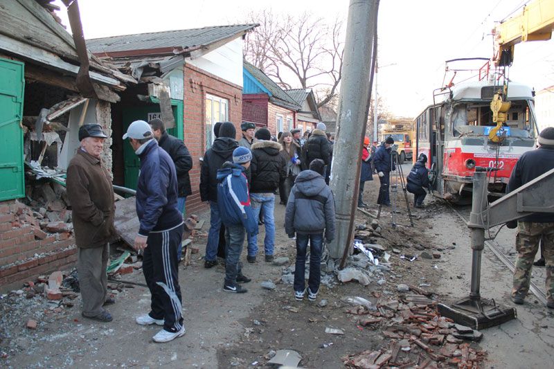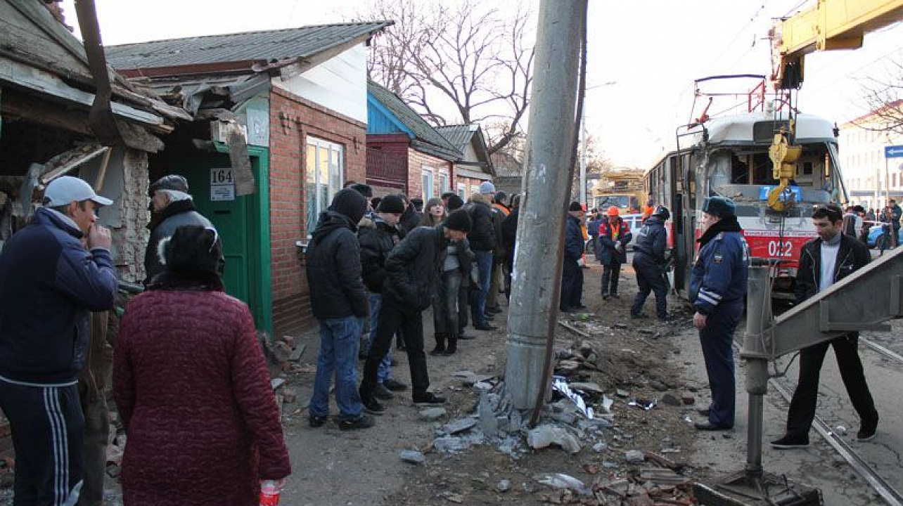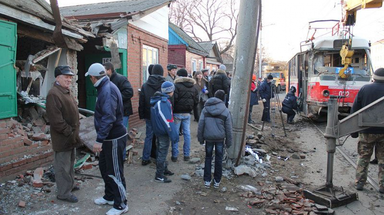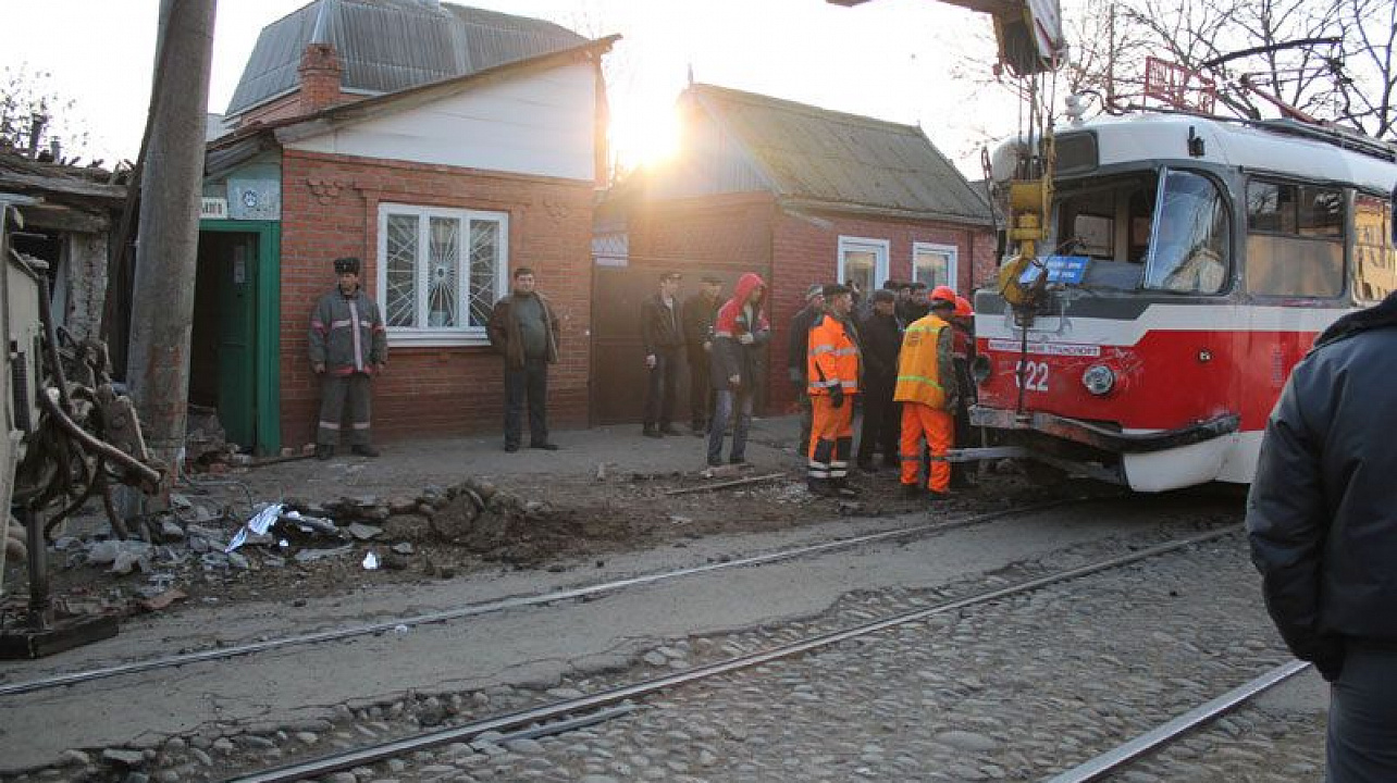 В результате трамвай сошел с рельсов и врезался в одноэтажное домовладение, расположенное в непосредственной близости от трамвайного полотна.
