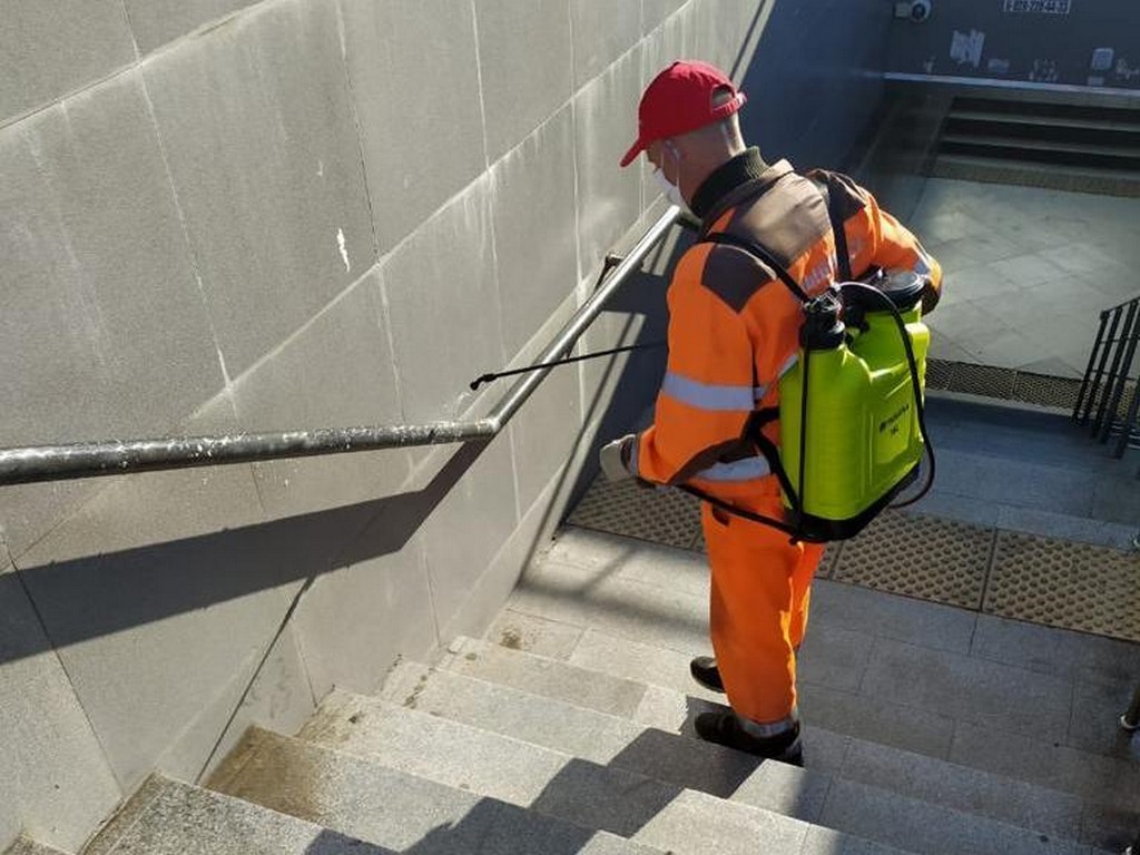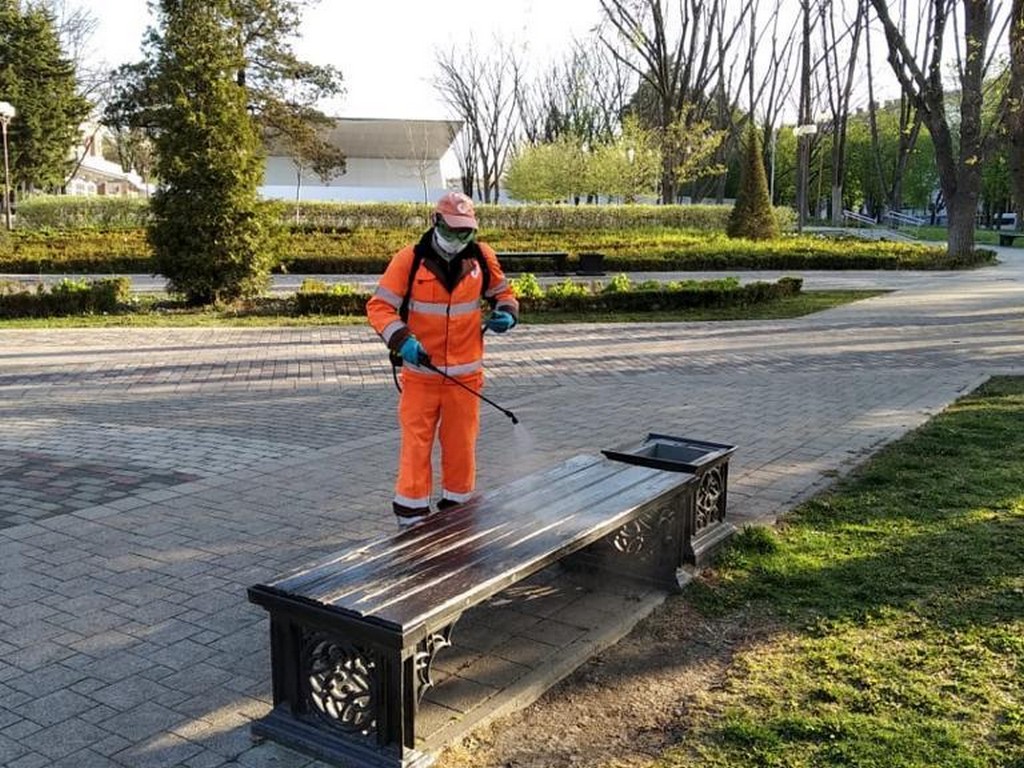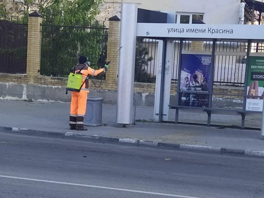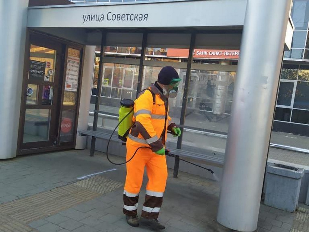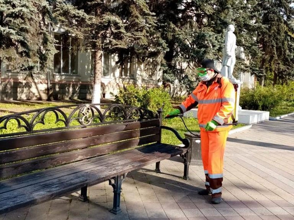 18 апреля 2020С применением дезинфицирующих и антисептических препаратов несколько раз в день обрабатывают весь городской общественный транспорт. Ночью 8 поливомоечных машин обрабатывают дороги и тротуары, с раннего утра 60 специалистов с переносными ранцевыми опрыскивателями дезинфицируют остановки общественного транспорта, скверы, подъезды домов, детские площадки.