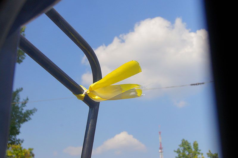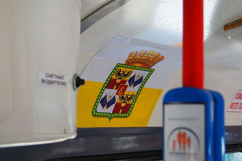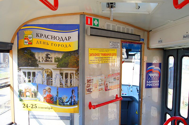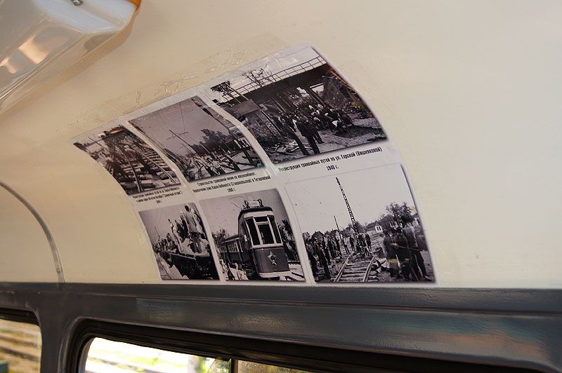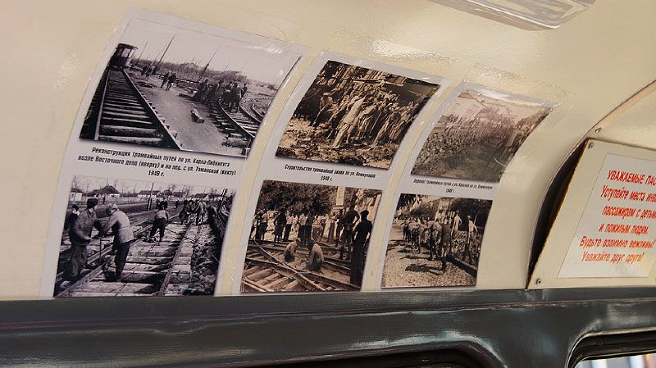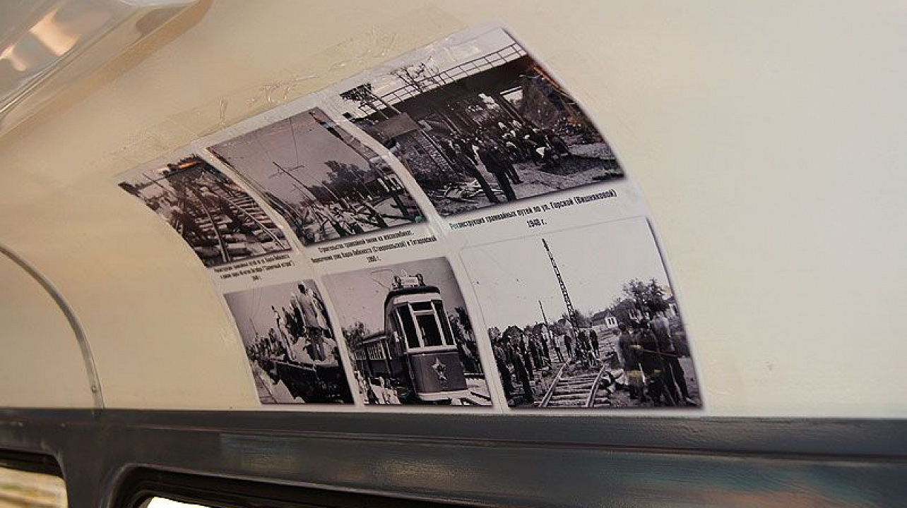 Водитель Западного трамвайного депо оформил маршрутные указатели вагона с бортовым номером 009 в бело—желтые тона флага кубанской столицы, а в салоне организовал выставку фотографий послевоенного города.